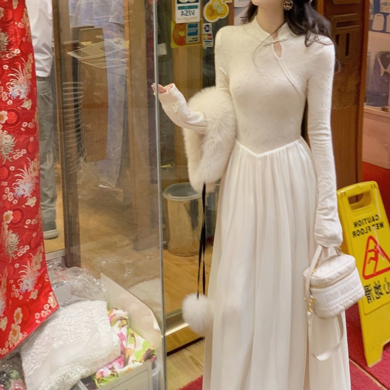 새로운 중국 스타일 패션 우아한 디자인 자카드 긴 소매 원피스 겨울 새로운 슬림 핏 베이스 내부 청삼 스커트스토어 가기