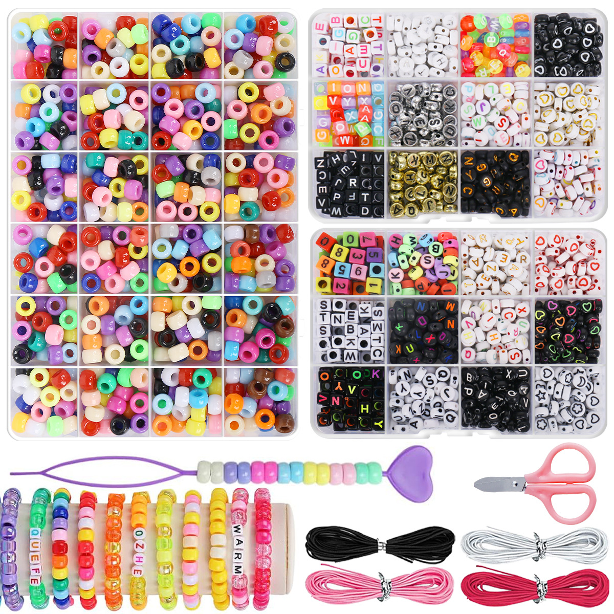 • 따뜻한 버킷 비즈 24개 + 그리드 문자 24개 + 핑크, 블랙, 로즈, 화이트 4실 + 가위 1개 + 머리핀 2개