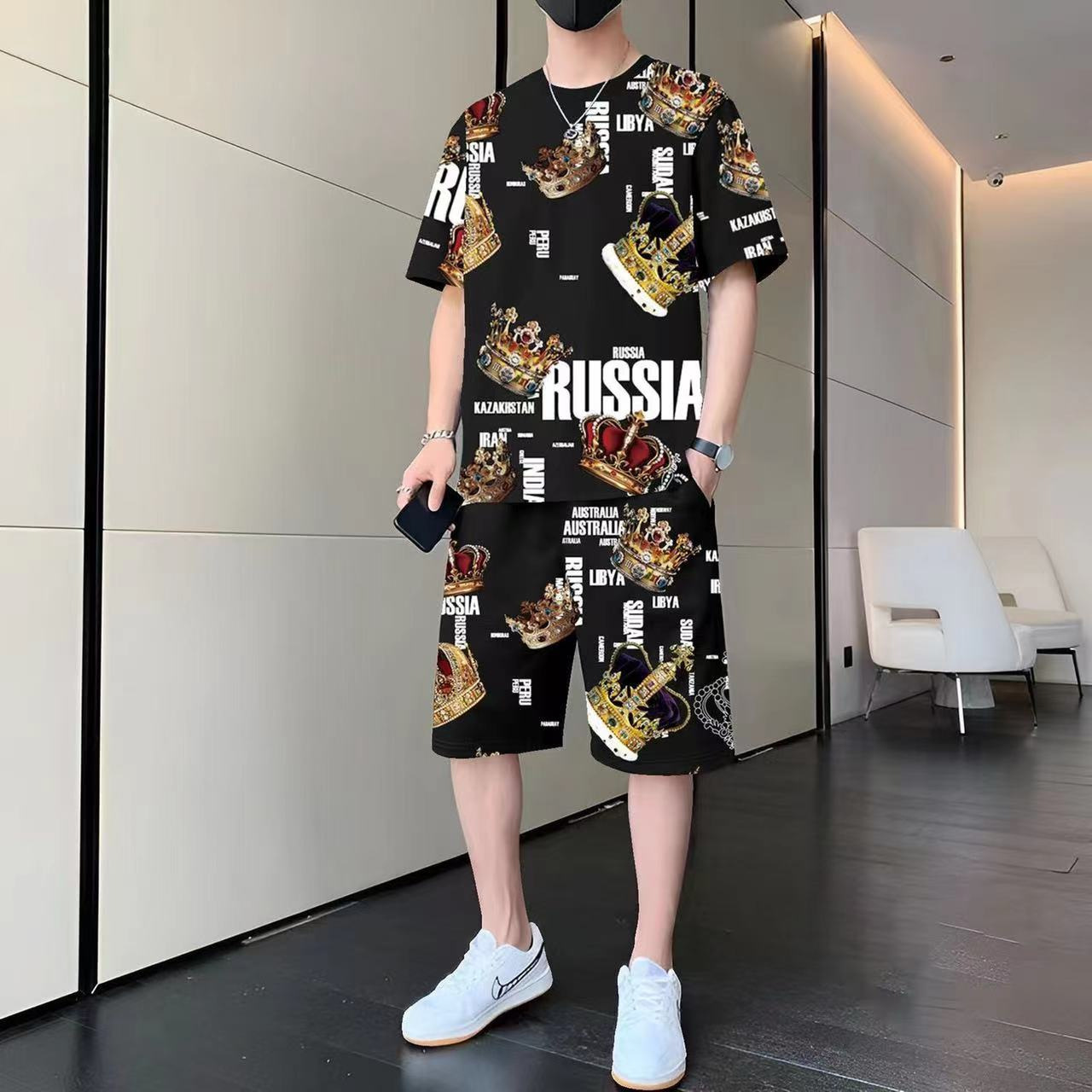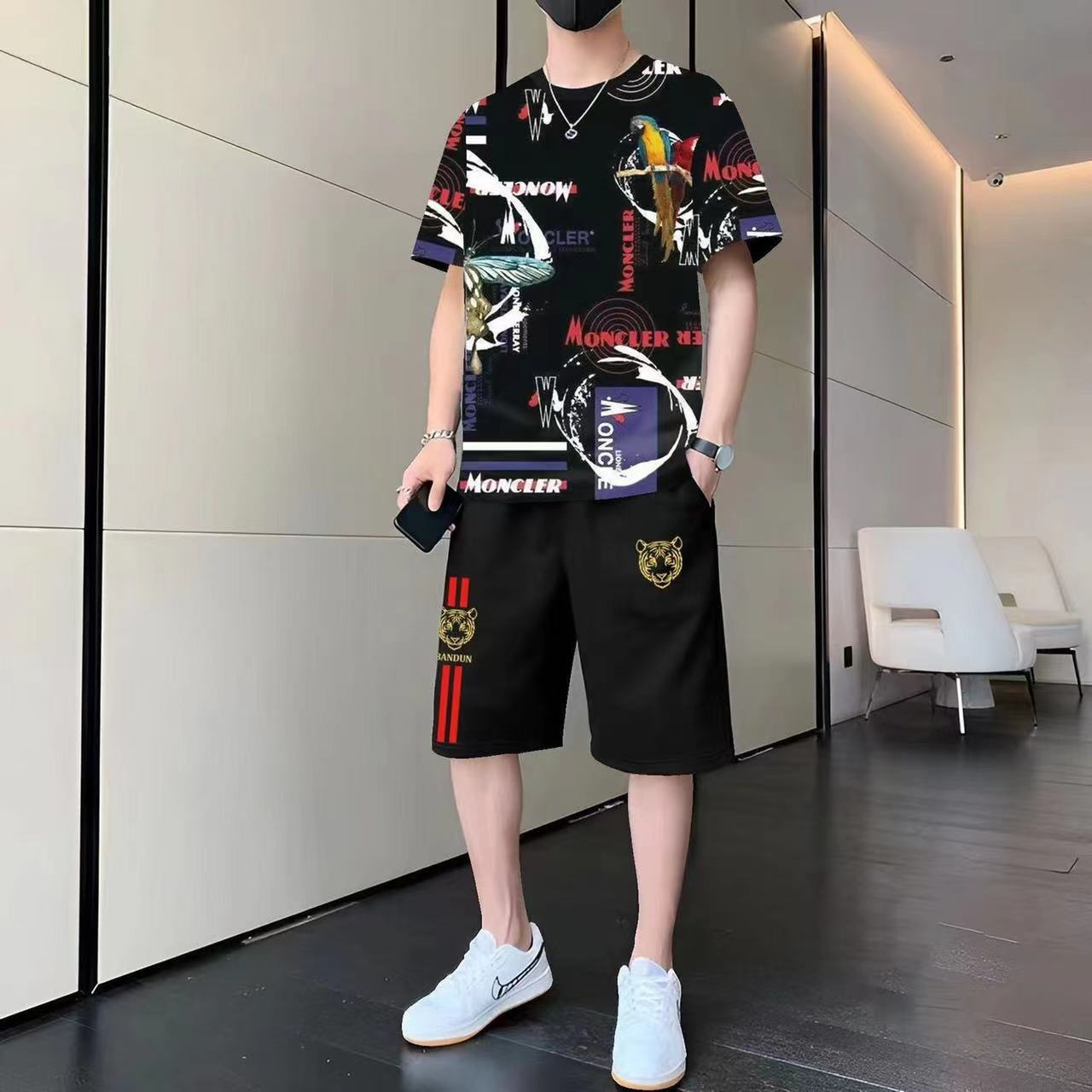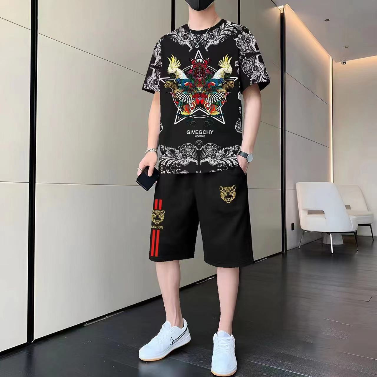 여름 새 스타일 맞춤형 트렌디 한 남성 국가 스타일 투피스 세트 트렌디 한 반팔 반바지 캐주얼 스포츠 세트