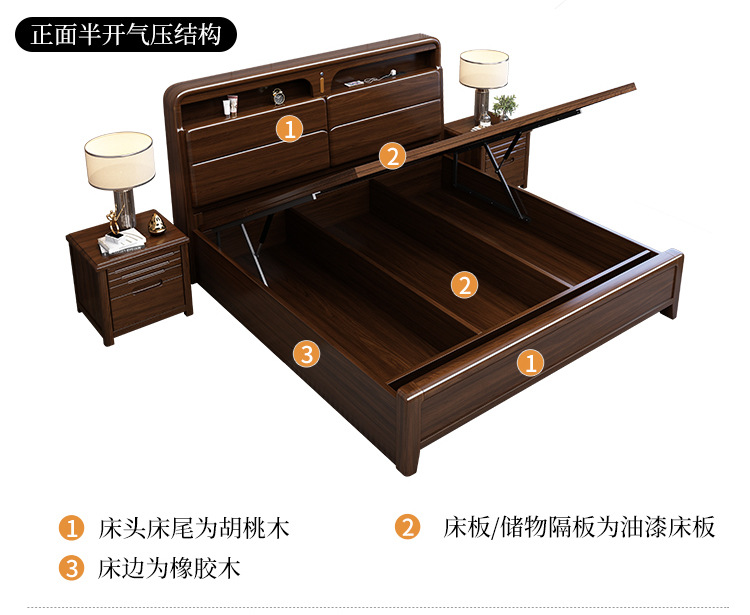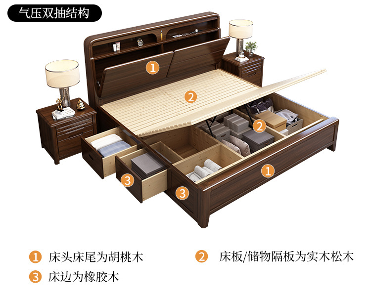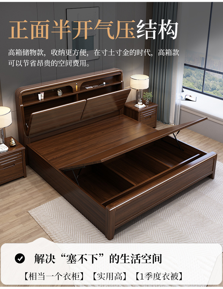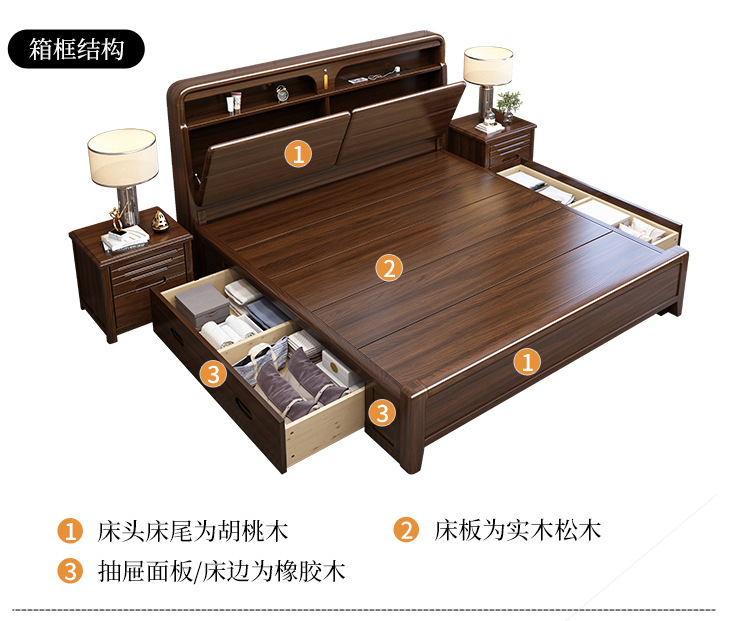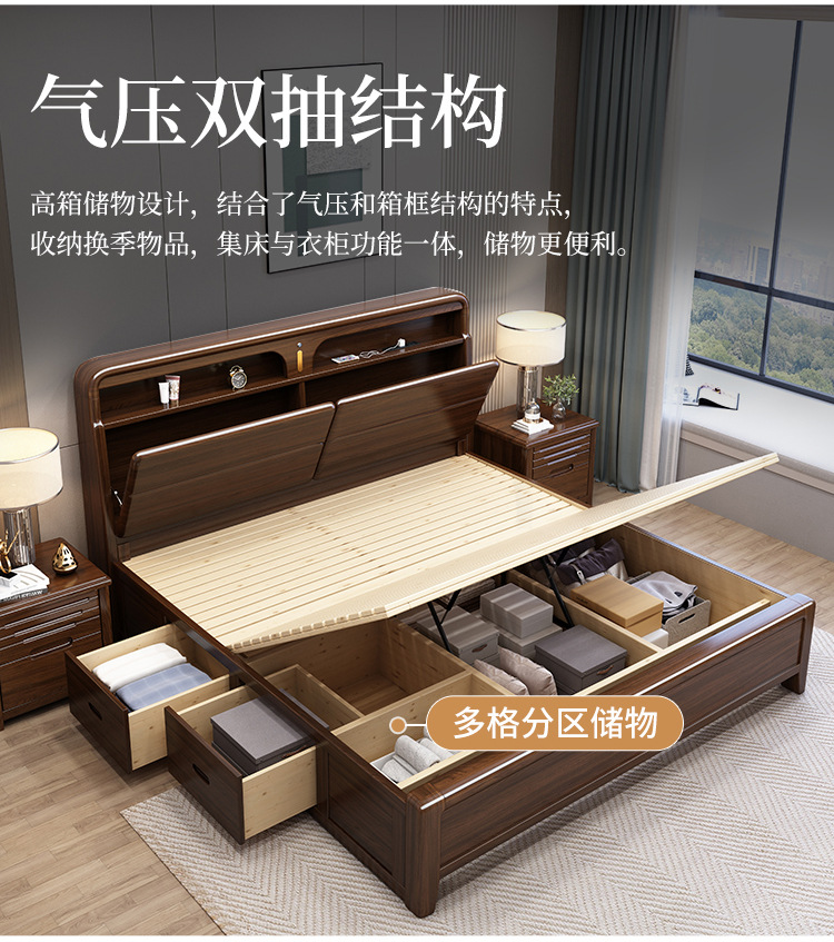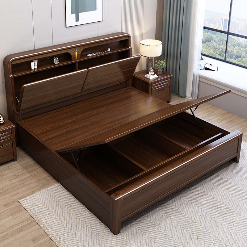 호두 높은 상자 저장 침대 단단한 나무 더블 침대 중국 단단한 나무 침대 2 m x 2 m 2 가득 차있는 단단한 나무 침실 상자 침대스토어 가기