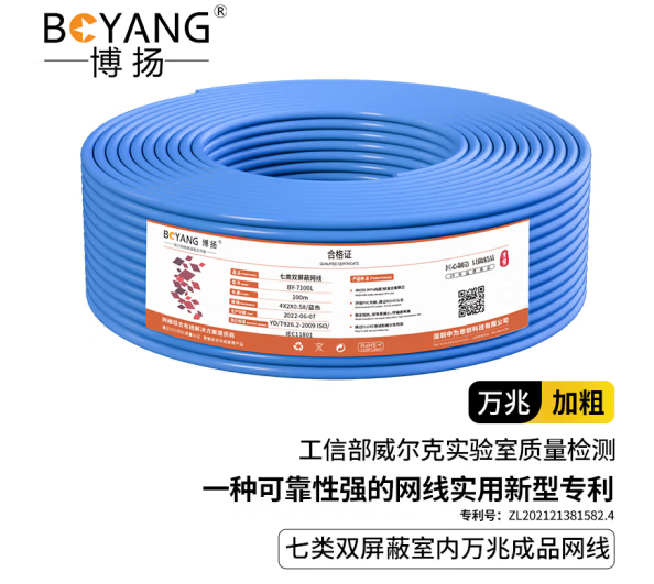 博扬(BOYANG)七类双屏蔽网线S/FTP Cat7类低烟无卤万兆网线 0.58无氧铜线径工程级双绞线 100米/蓝色BY-7100L *1 合格证*1 保修卡*1
