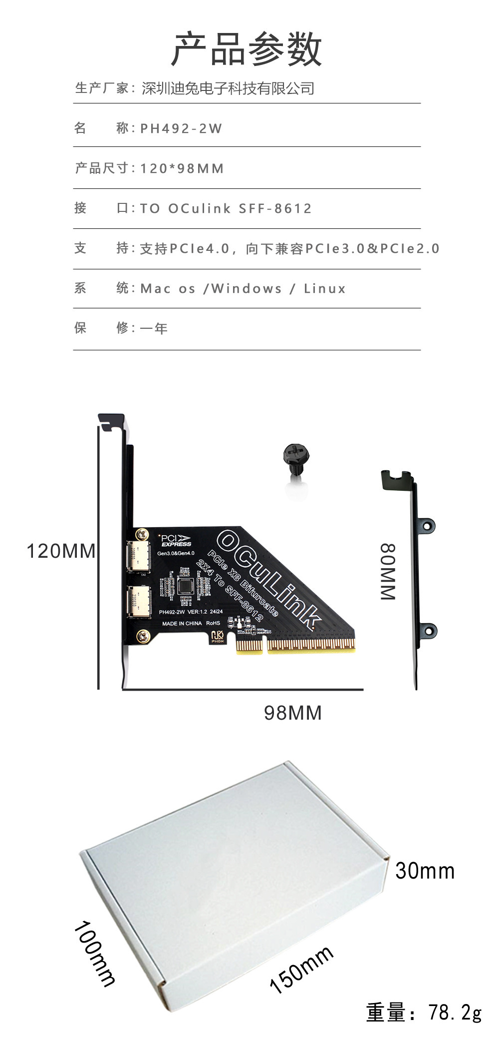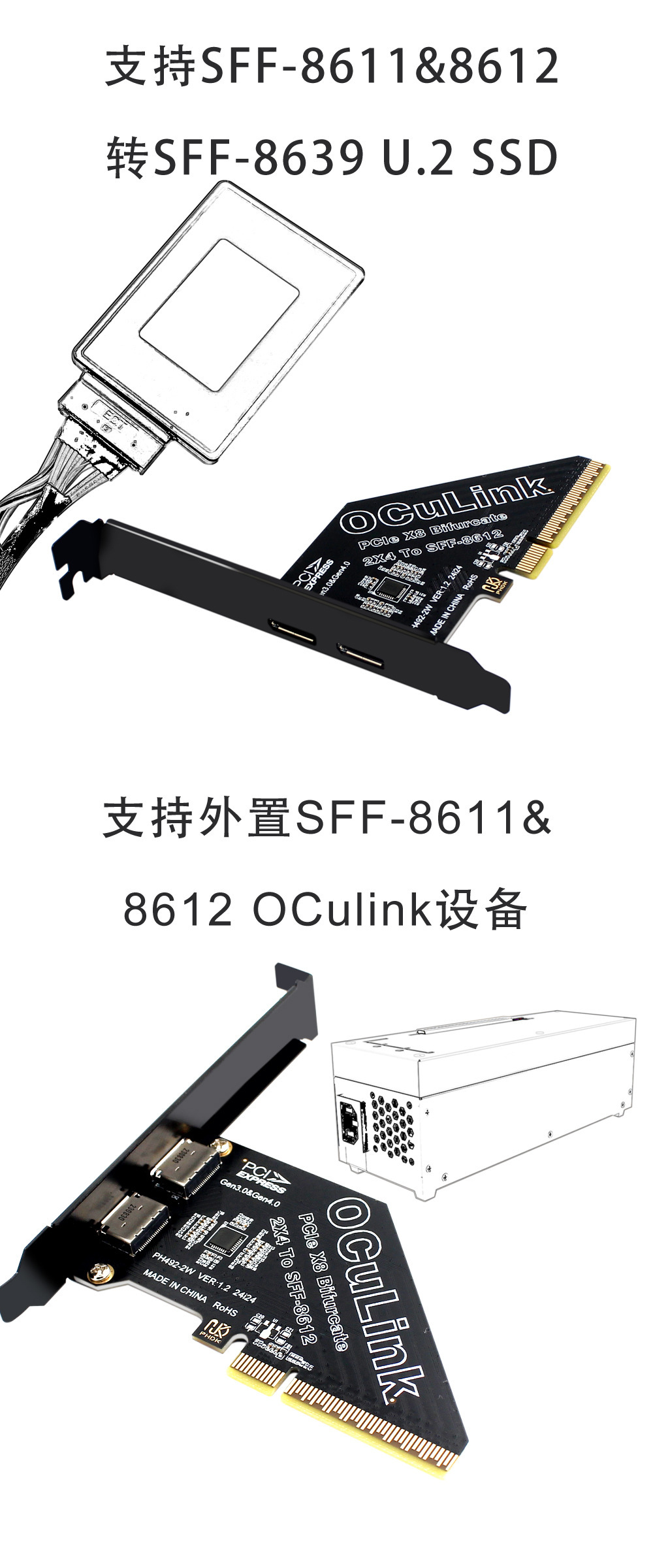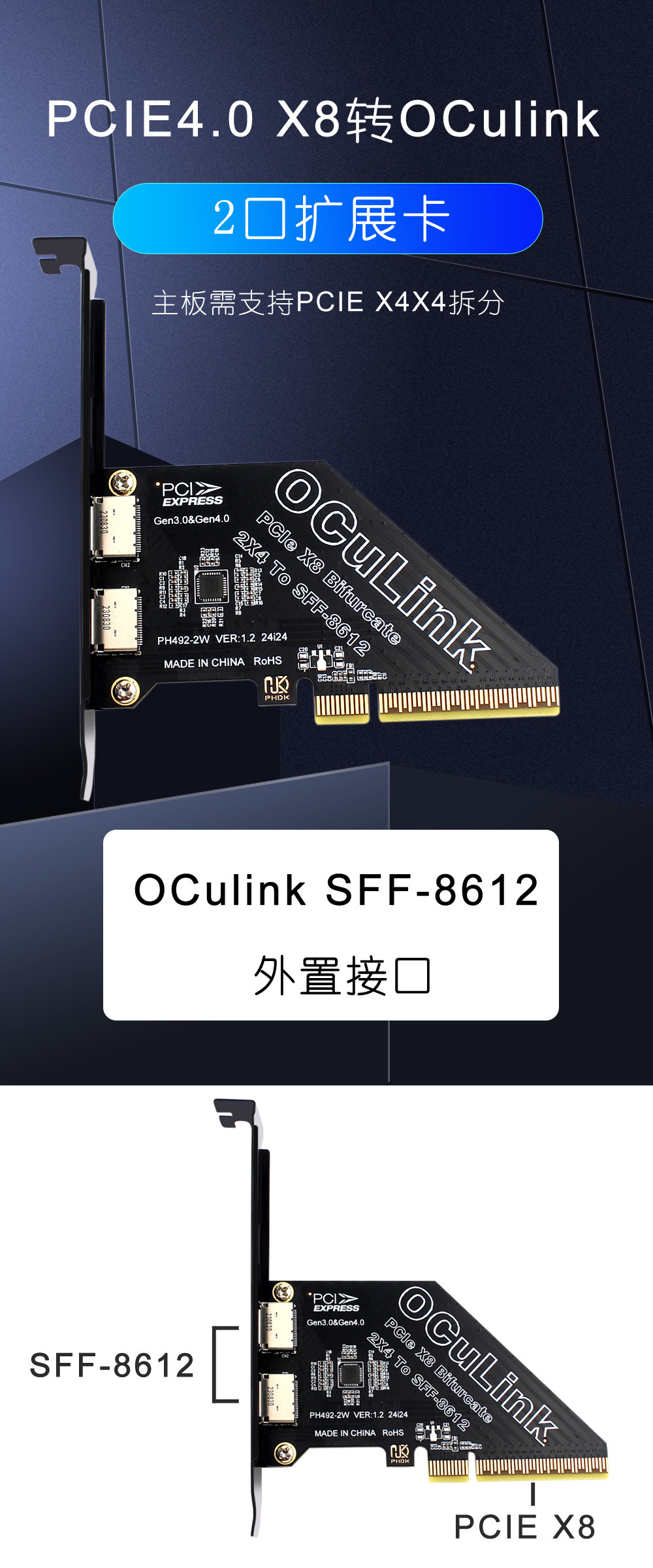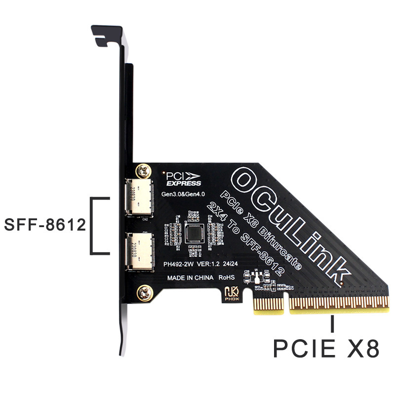 PCIe X8 분할 2 포트 SFF8611 및 8612 Oculink 확장 카드 외부 U.2SSD 외부 그래픽 카드