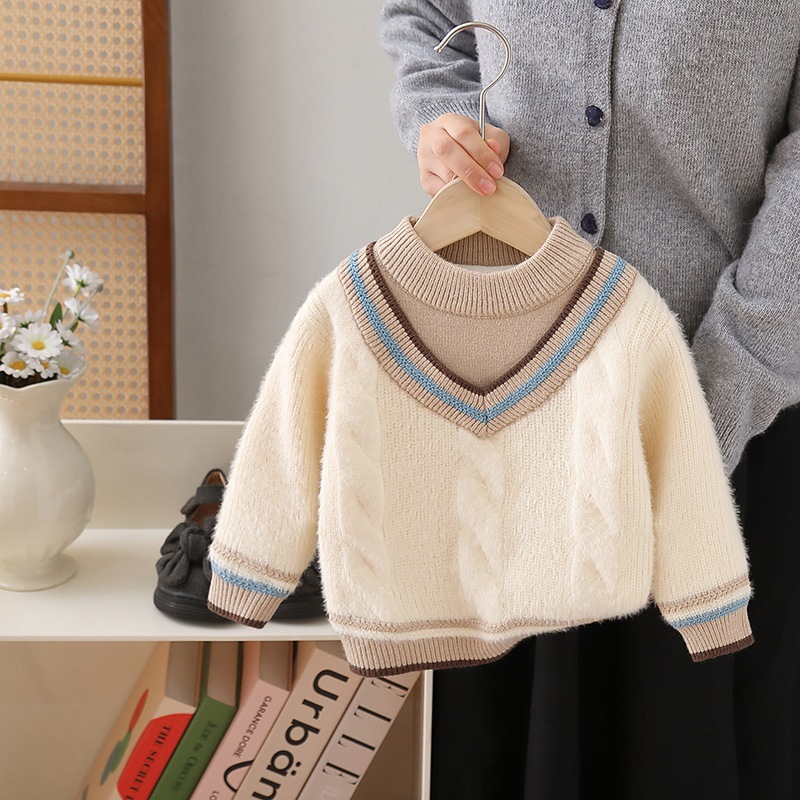겨울 소년 스웨터 기모 V-Neck 어린이 니트 탑 언더 코팅 외국 스타일 올 매치 심플 카키