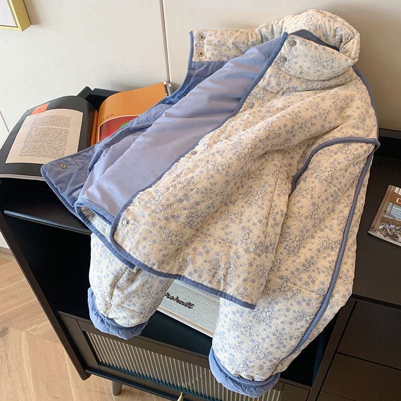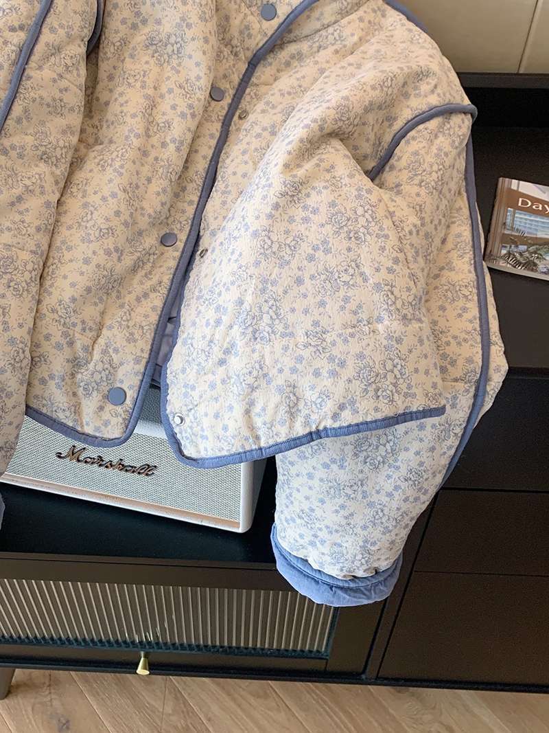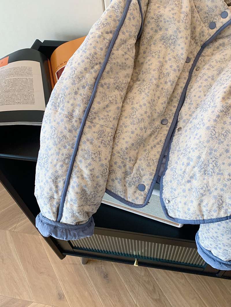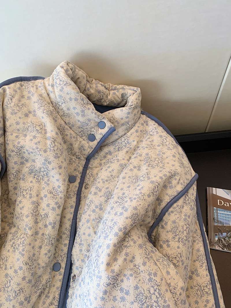 파란색 작은 꽃 코듀로이 바느질면 패딩 재킷 코트 여성의 2024 겨울 새로운 따뜻한 게으른 스타일 한국 탑