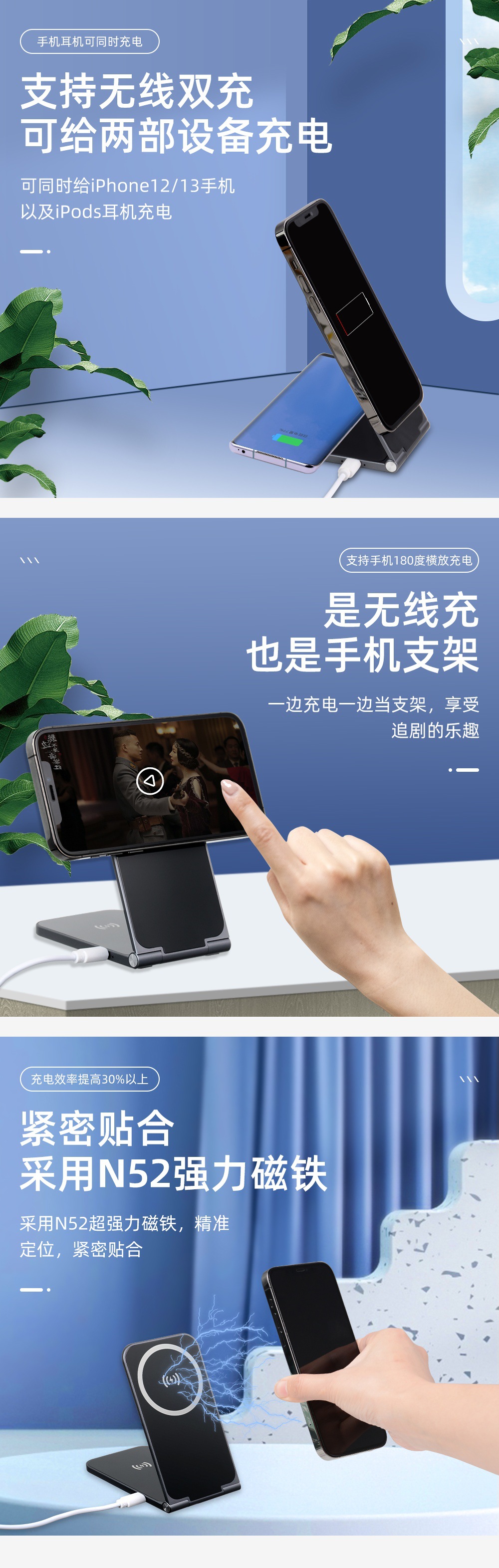 7)支持无线双充,可同时给iPhone12/13手机以及iPods耳机充电。