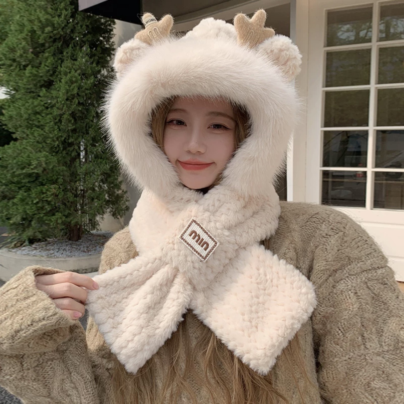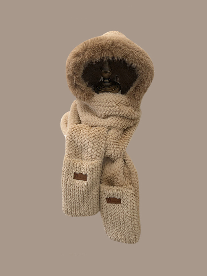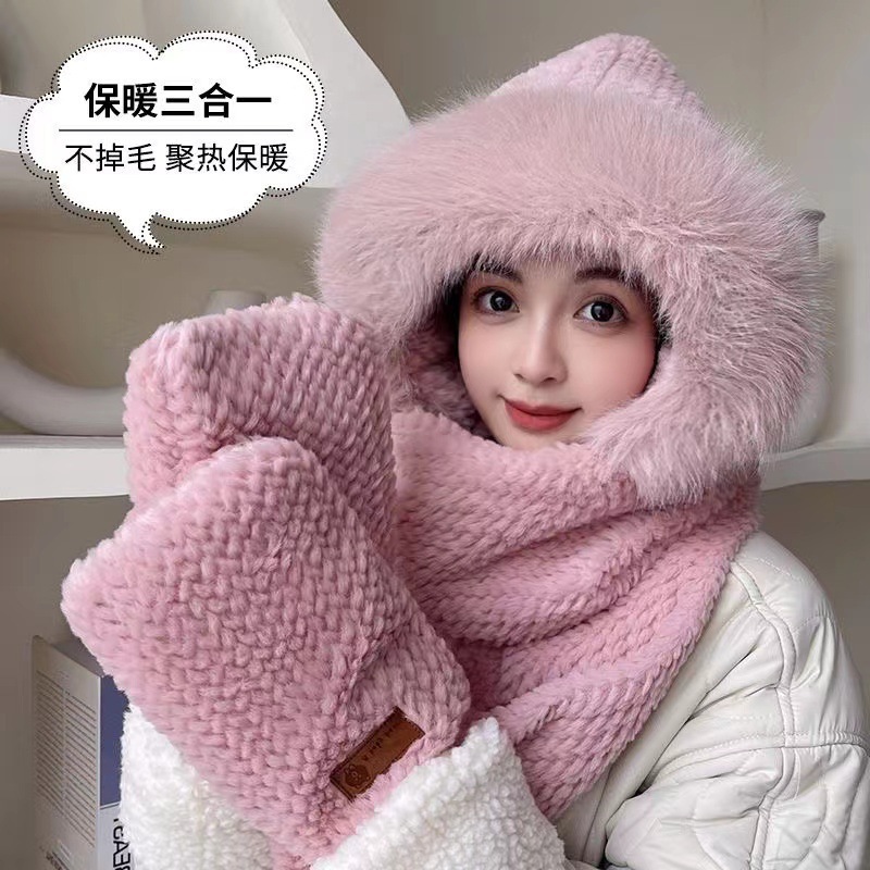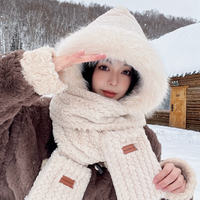 곰 모자 봉제 스카프 여성의 겨울 귀여운 겨울 스카프 투피스 세트 후드 원피스 귀 보호 모자 따뜻한 패션