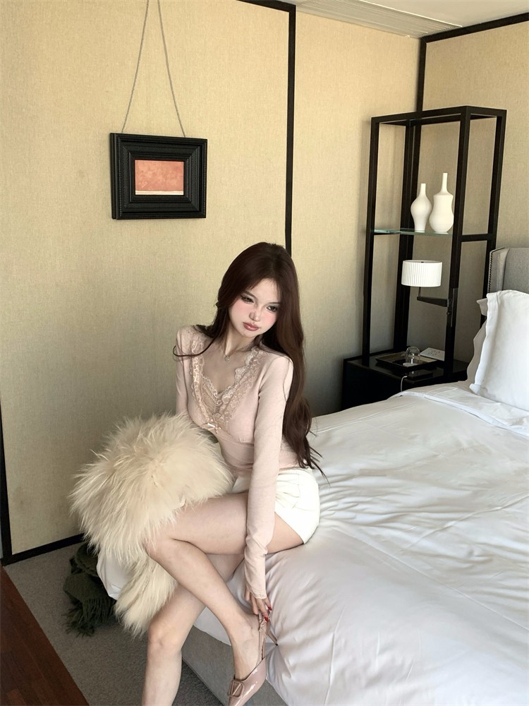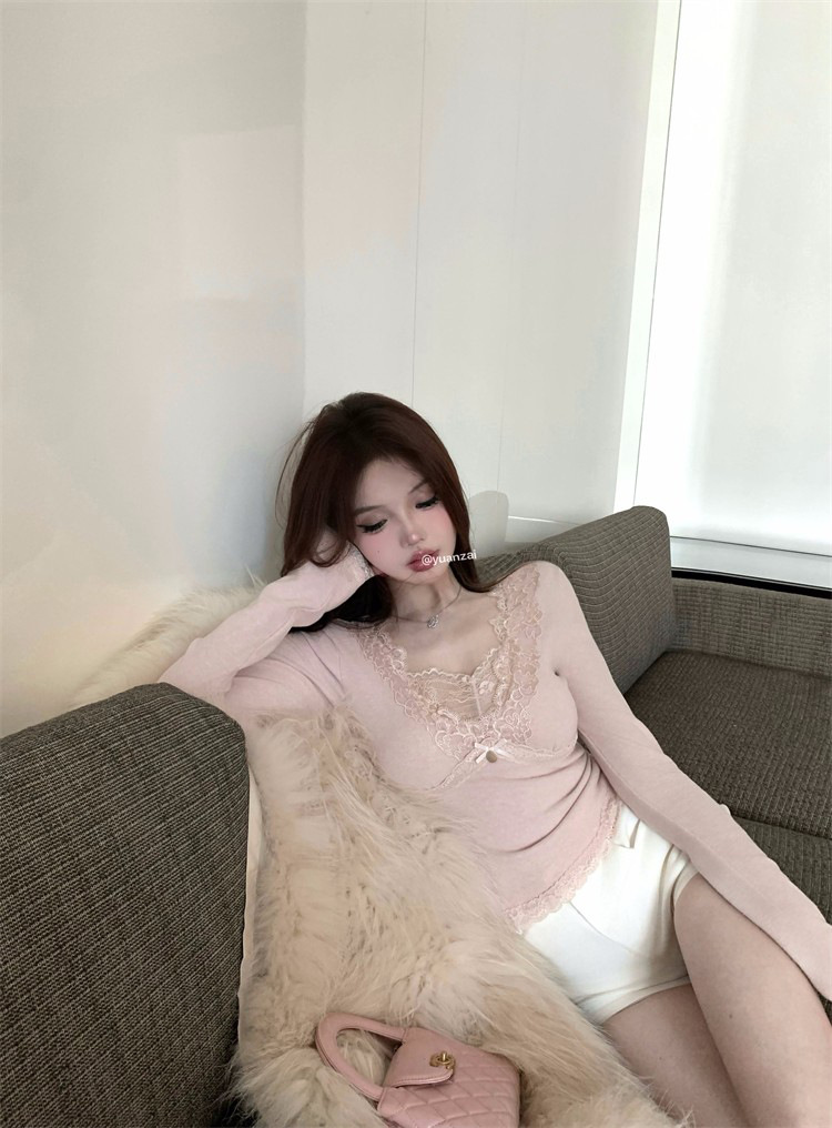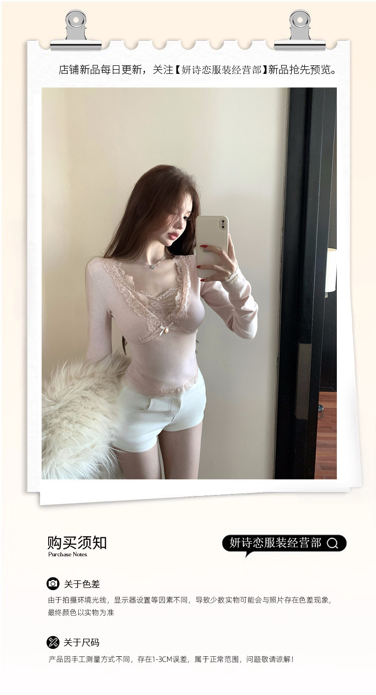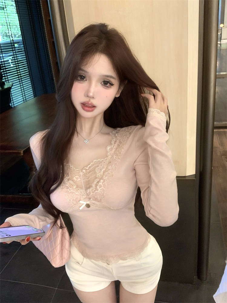 레이스 바느질 V-Neck 긴팔 티셔츠 여성의 가을과 겨울 슬림-꽉 끼는 내부 핑크 짧은베이스 탑스토어 가기