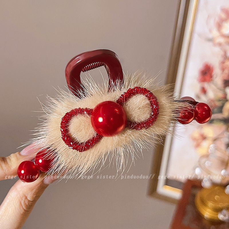 빨간 봉제 백조 그랩 클립 여성의 하이 엔드 센스 마오 헤어 클립 머리 상어 클립 가을 겨울 새해 축제 헤어 액세서리