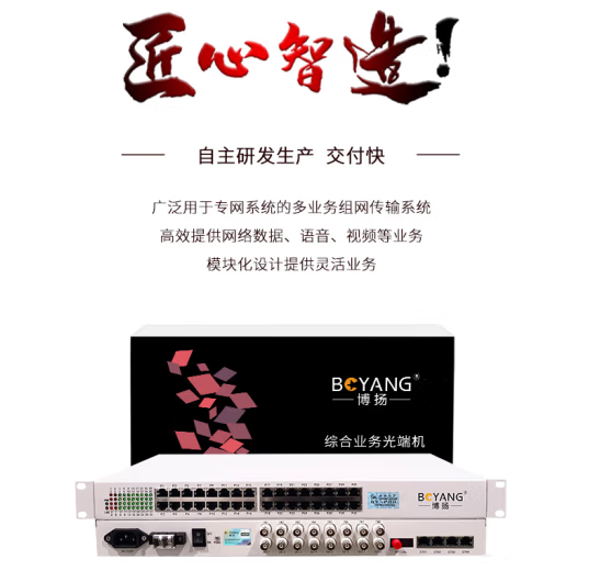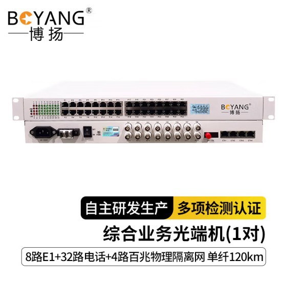 博扬 多功能综合业务光端机 8E1+32电话+4路百兆以太网物理隔离 单纤120km 1对 BY-8E1-32P4EV-120km*1*合格证*保修卡