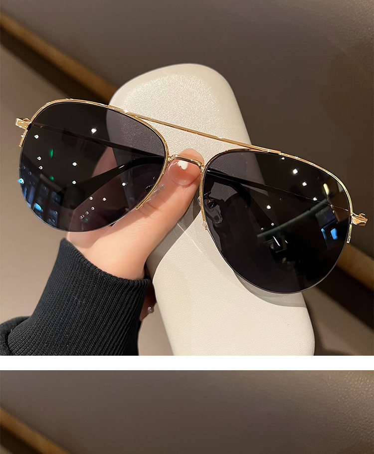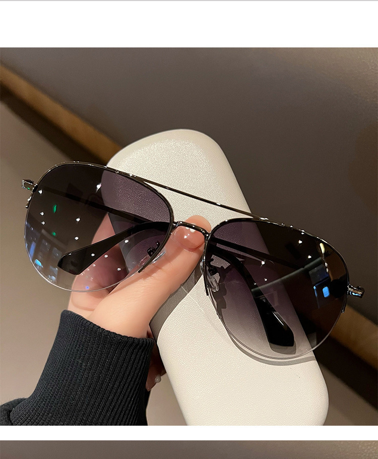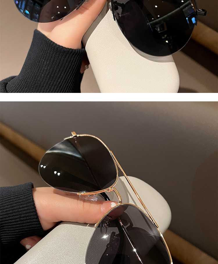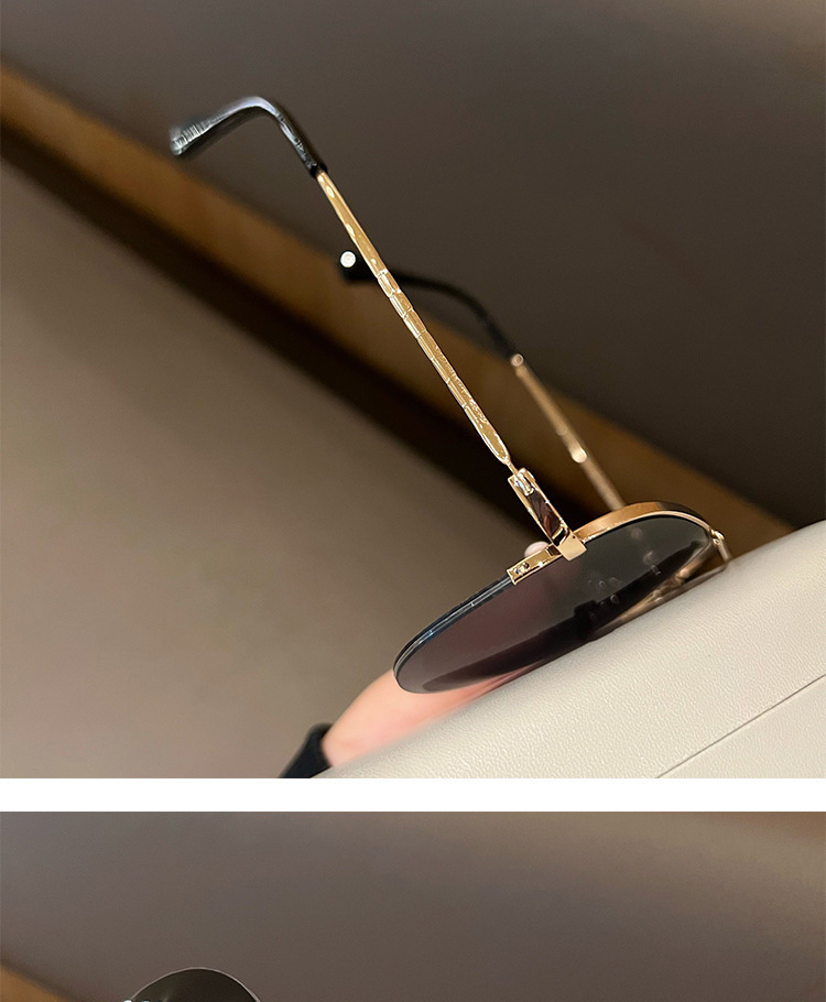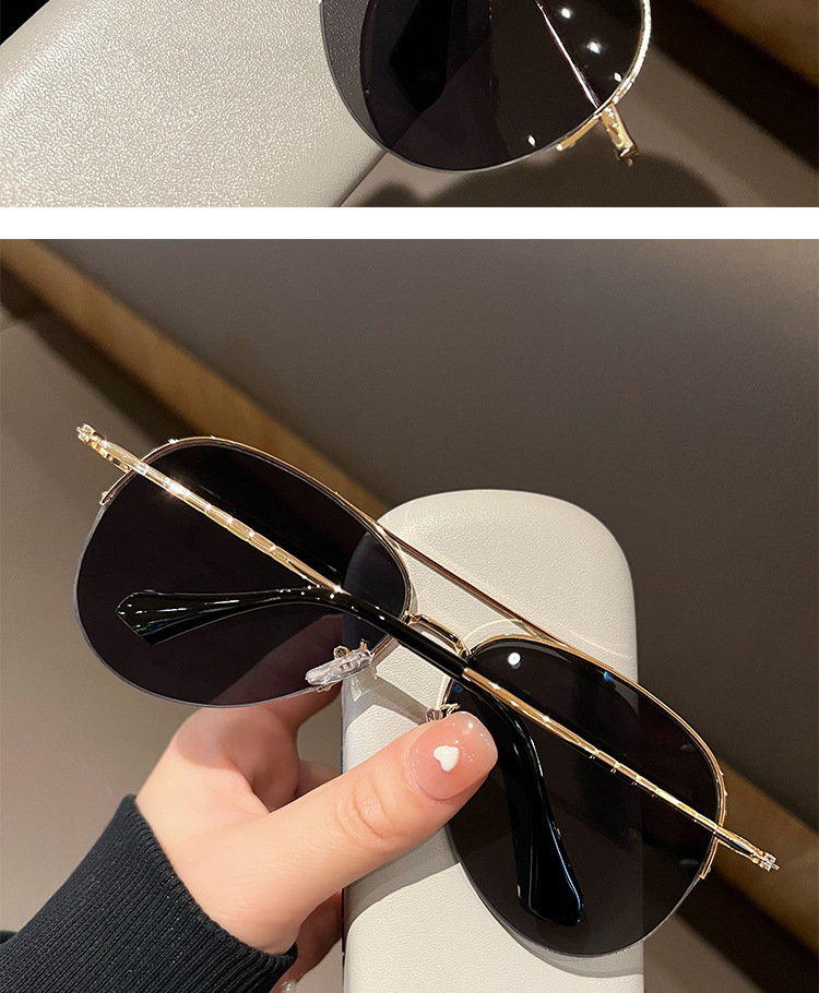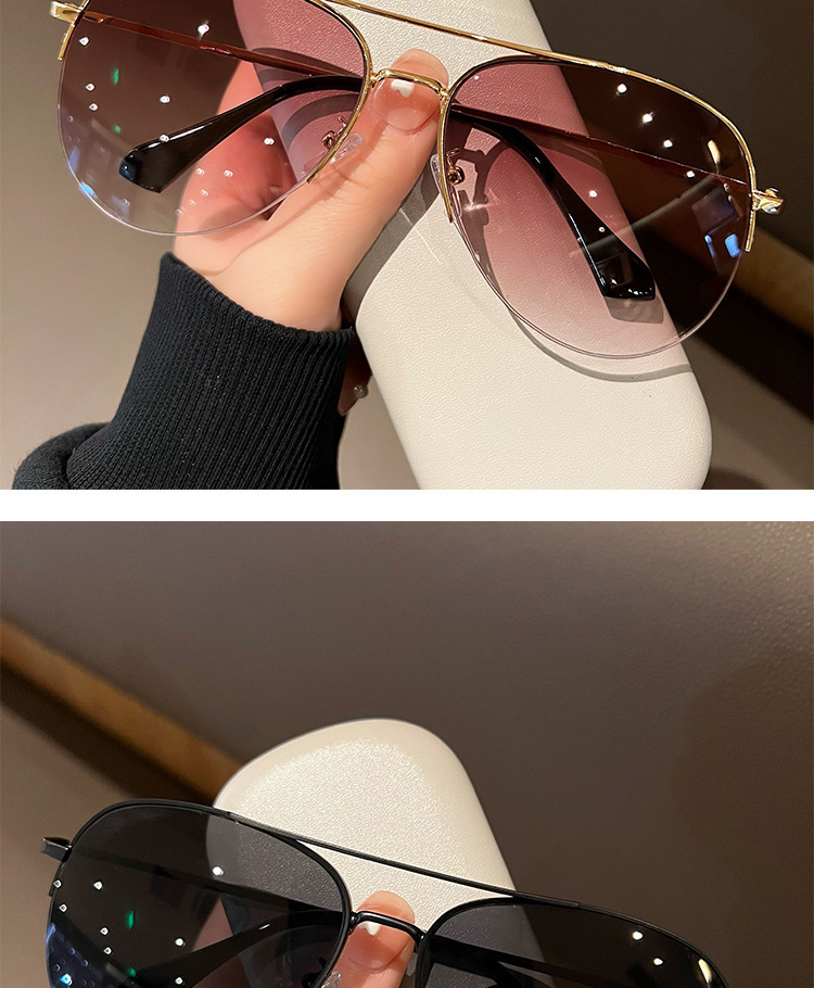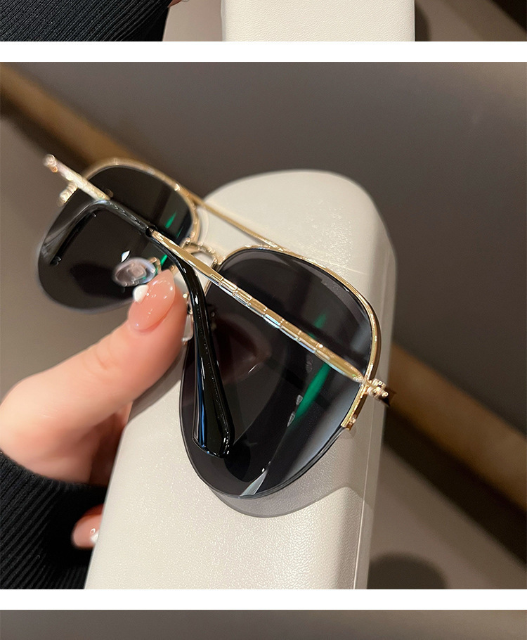 这款太阳镜自带无度数防紫外线太阳镜片,采有金属半框设计,洋气时尚,男女同款休闲百搭,加大框显瘦显脸小。