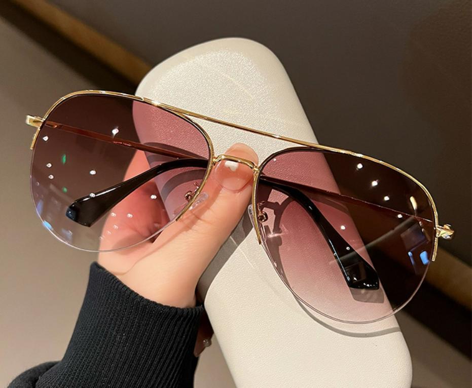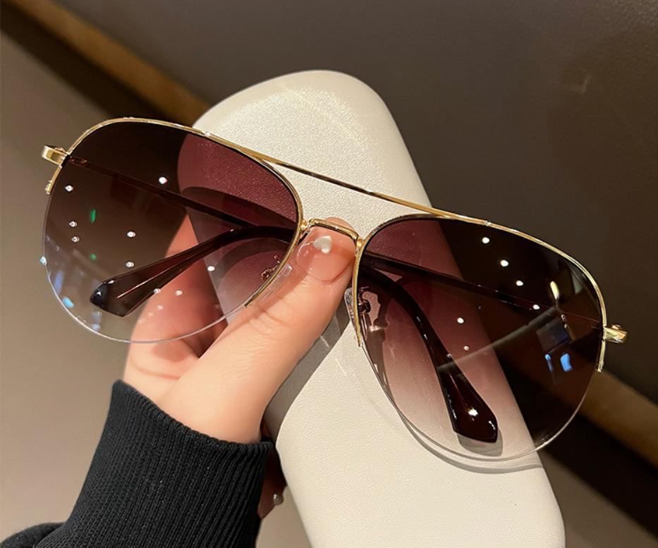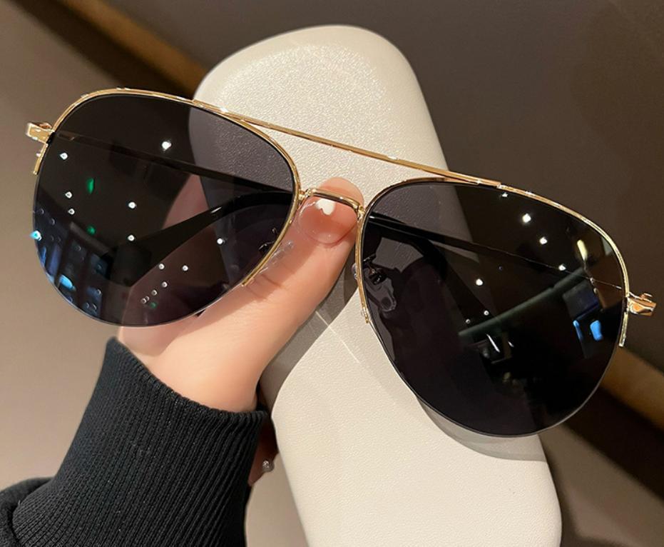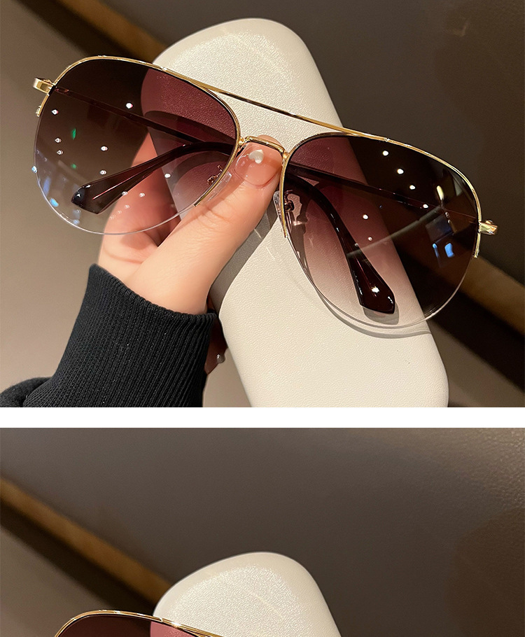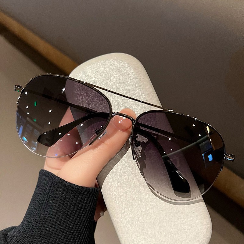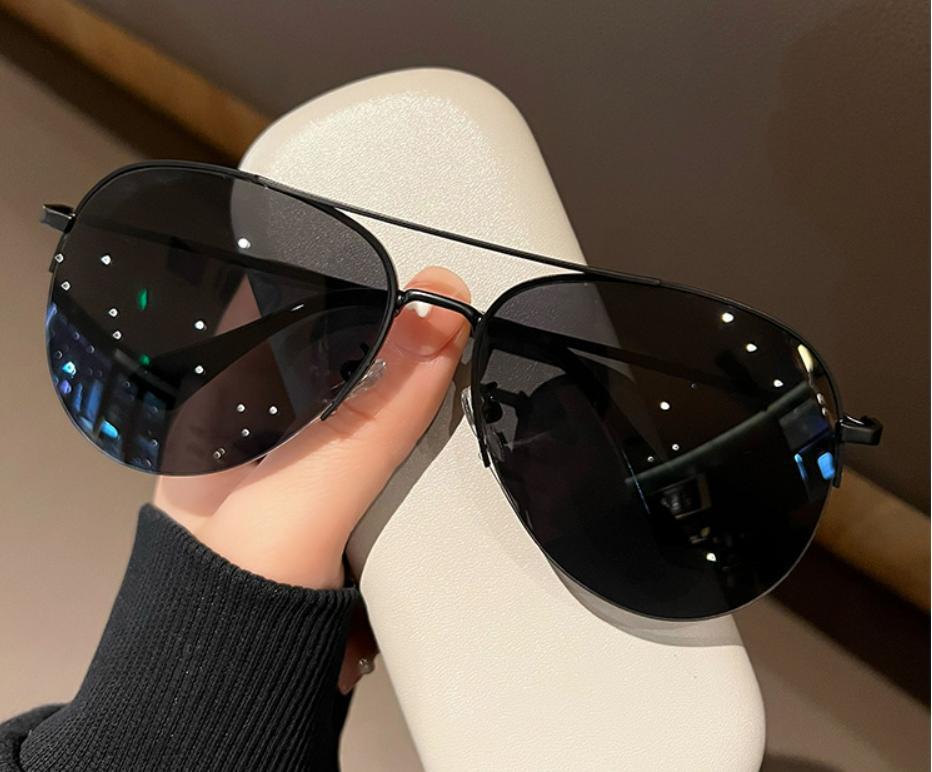 这款太阳镜自带无度数防紫外线太阳镜片,采有金属半框设计,洋气时尚,男女同款休闲百搭,加大框显瘦显脸小。