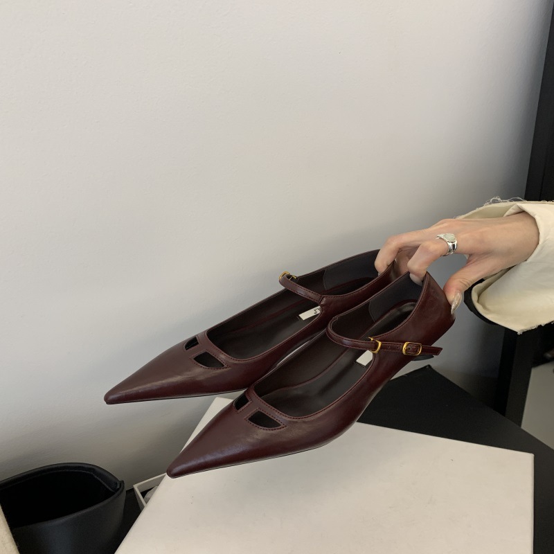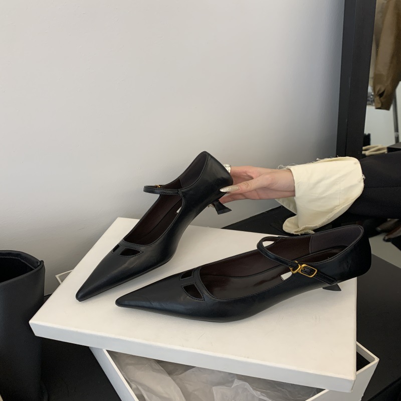 2024 새로운 도착 한 줄 버클 우아한 얕은 입 통근 원피스 싱글 레이어 신발 여성 유행 고양이 뒤꿈치 할로우 메리 제인 여성 신발