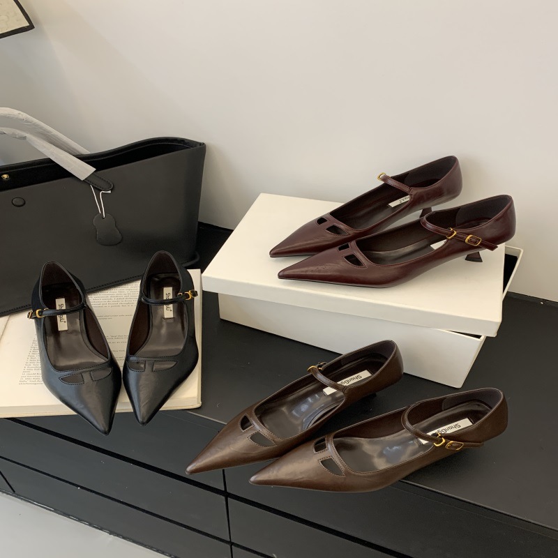 2024 새로운 도착 한 줄 버클 우아한 얕은 입 통근 원피스 싱글 레이어 신발 여성 유행 고양이 뒤꿈치 할로우 메리 제인 여성 신발스토어 가기