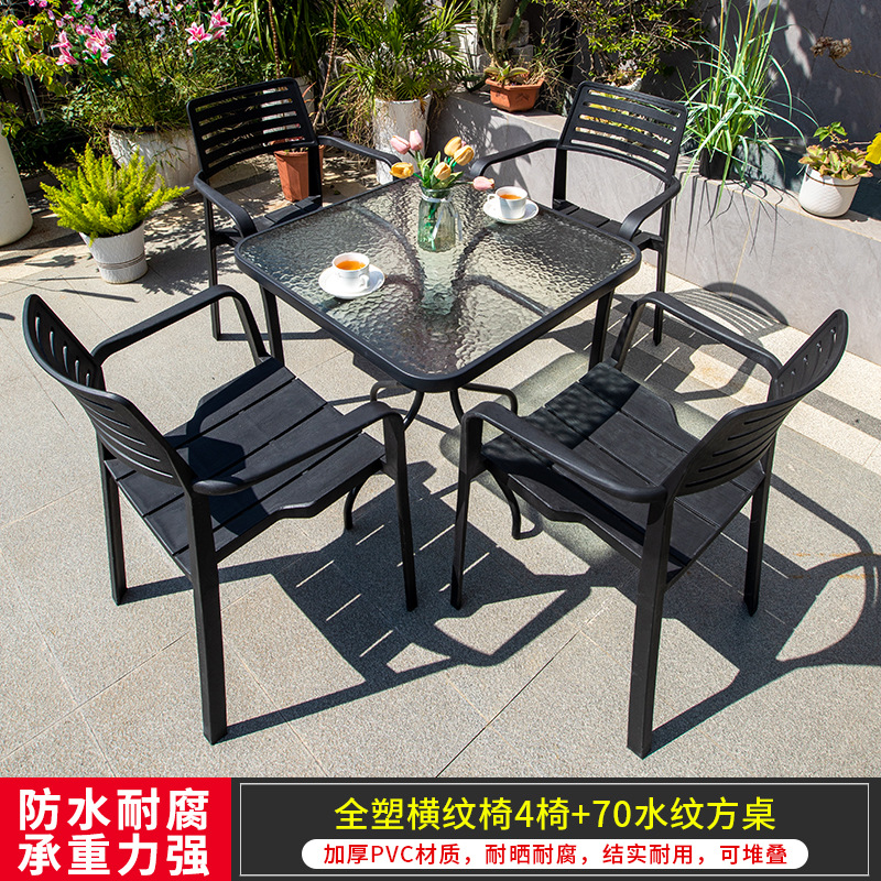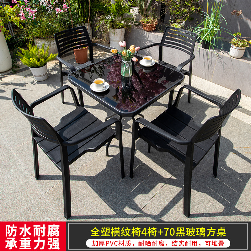 • 전체 플라스틱 가로 패턴 의자 4개 + 검정색 유리 사각 테이블 70개