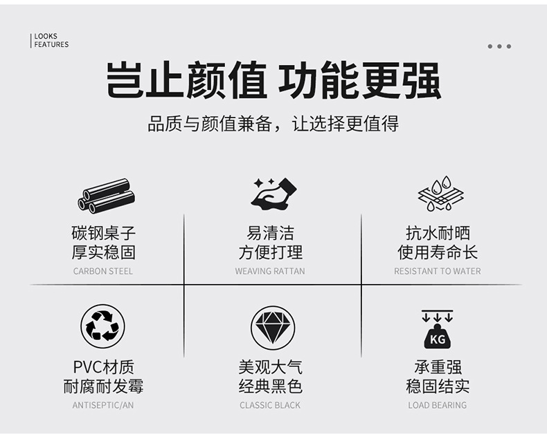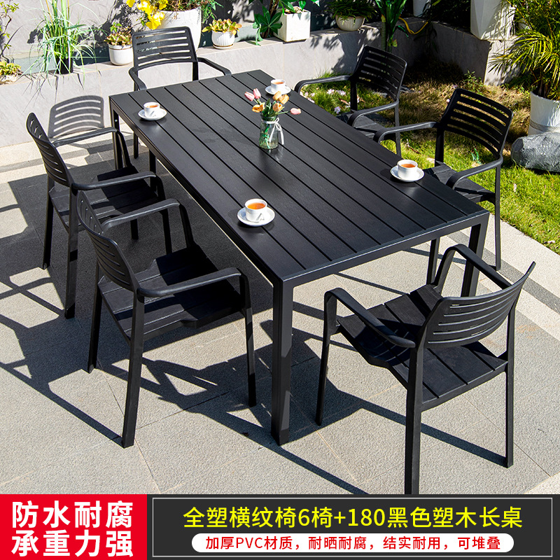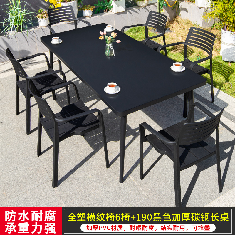 • 전체 플라스틱 수평 패턴 의자 6개 + 190 검정색 두꺼운 탄소강 긴 테이블