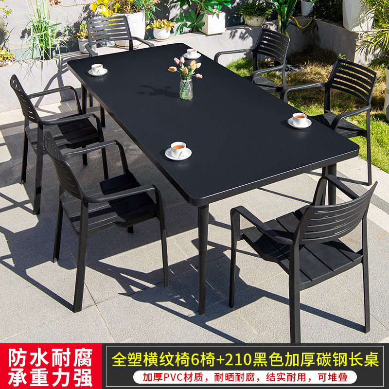 • 전체 플라스틱 수평 패턴 의자 6개 + 210 검정색 두꺼운 탄소강 긴 테이블