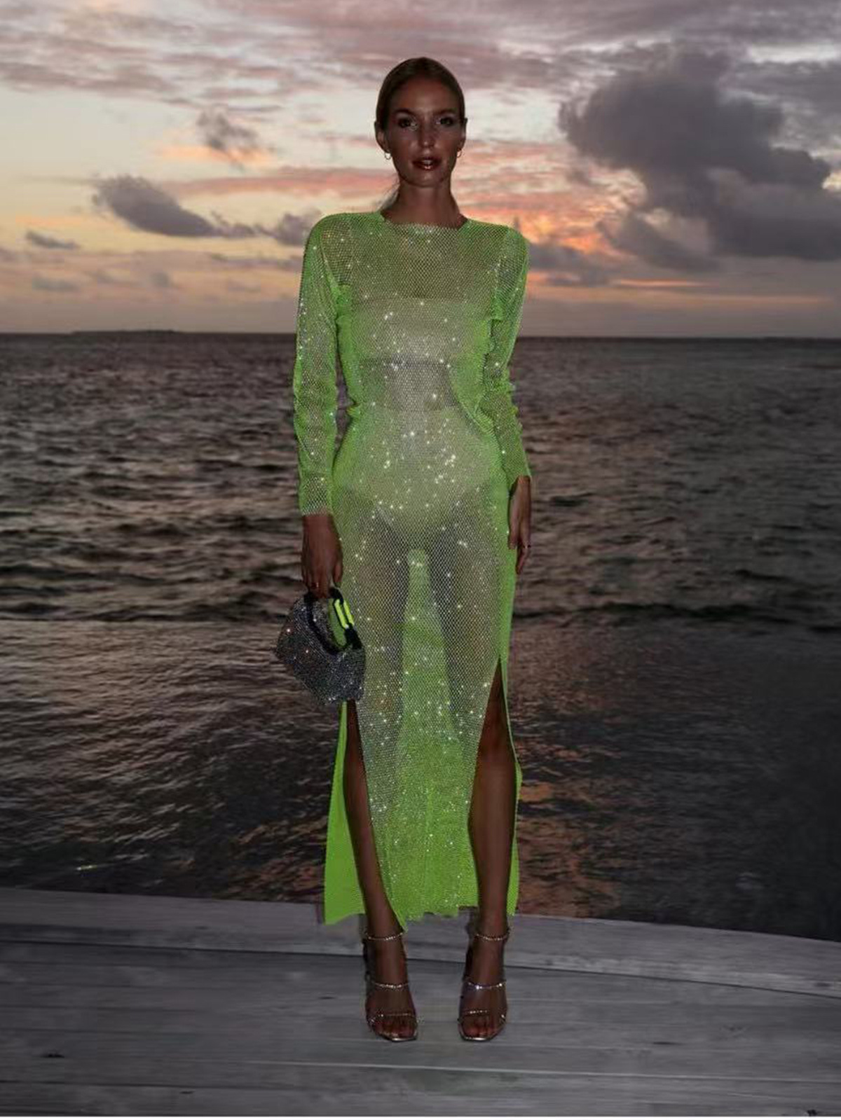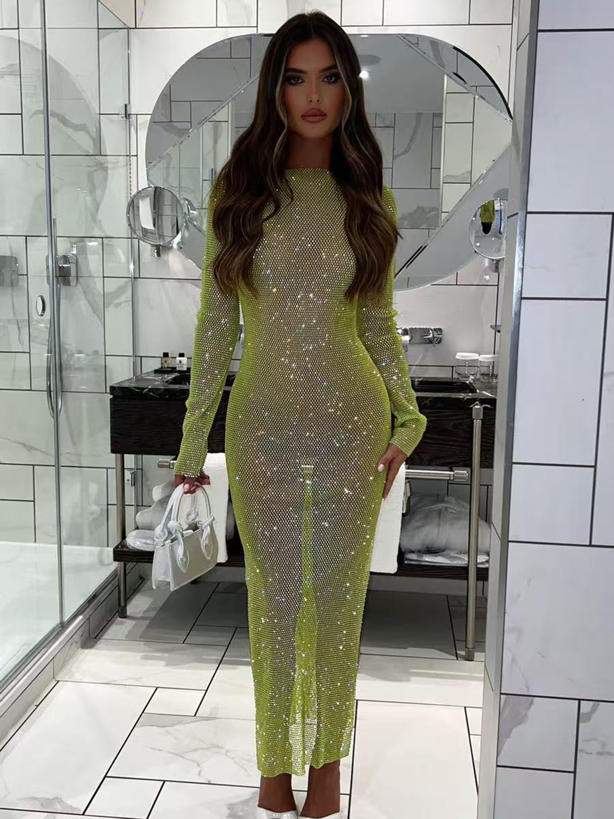Shein Amazon 유럽과 미국 국경 간 뜨거운 섹시한 타이트 스플릿 긴 소매 라인 스톤 파티 여성 원피스 원피스