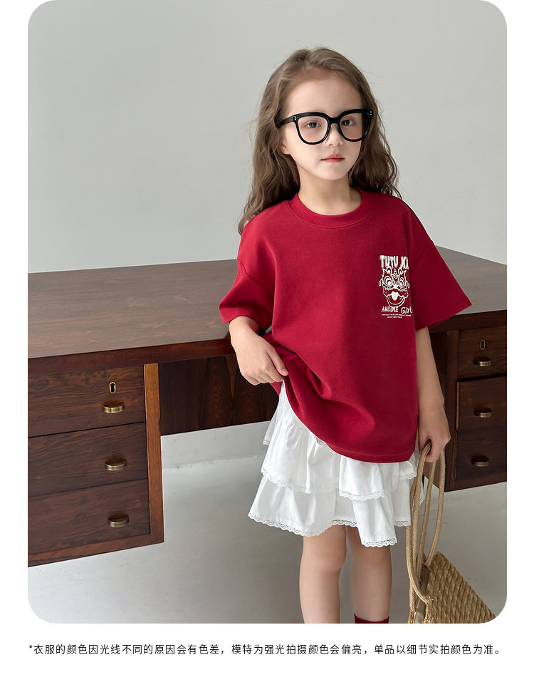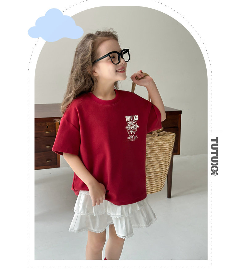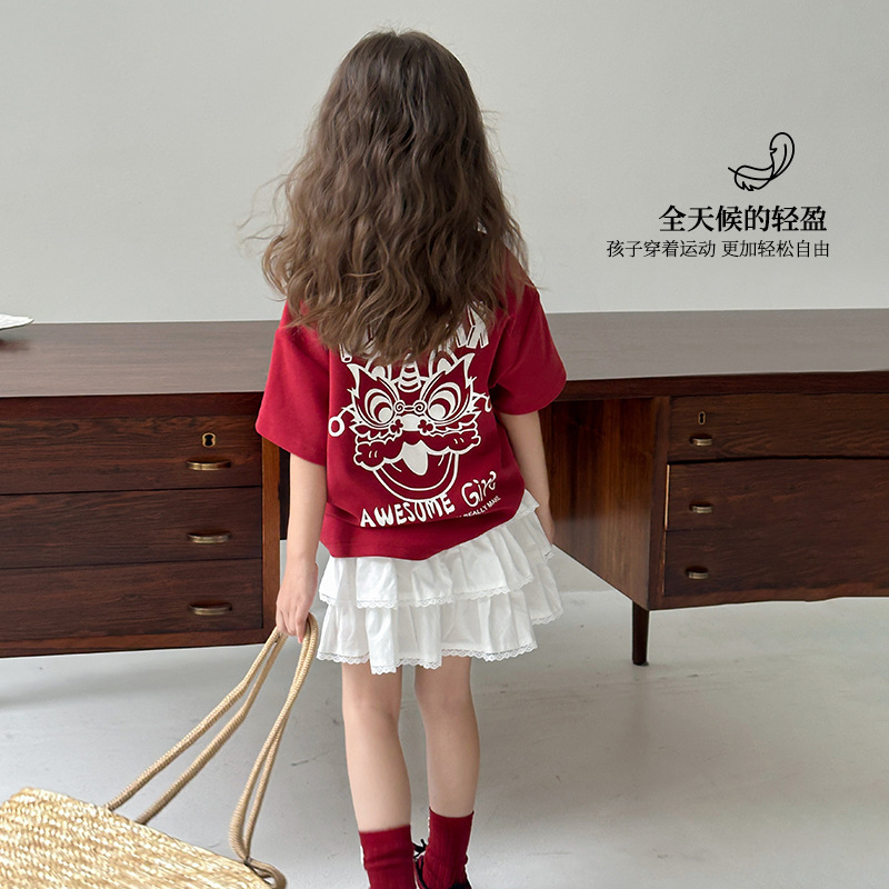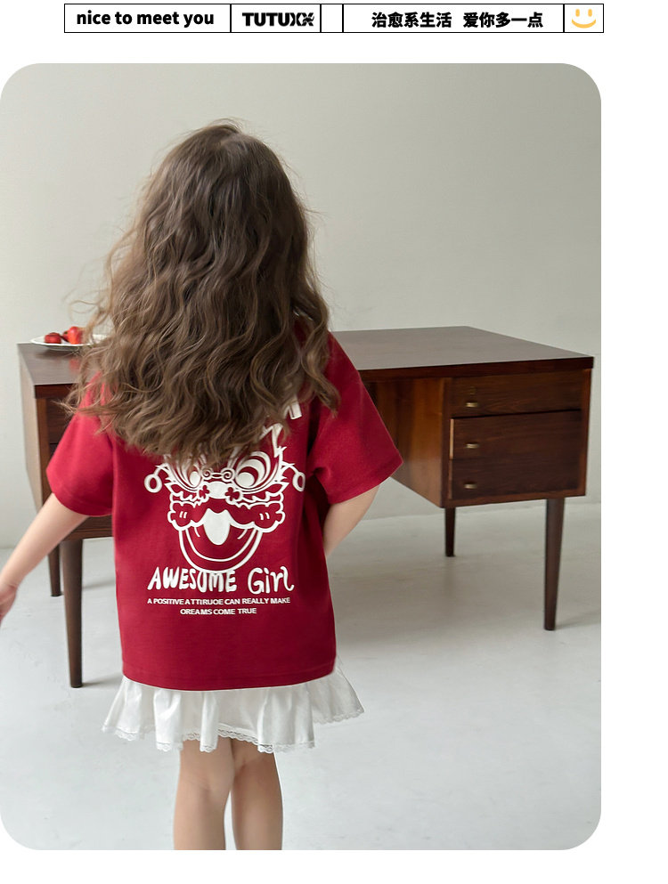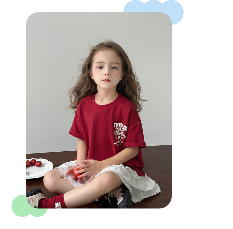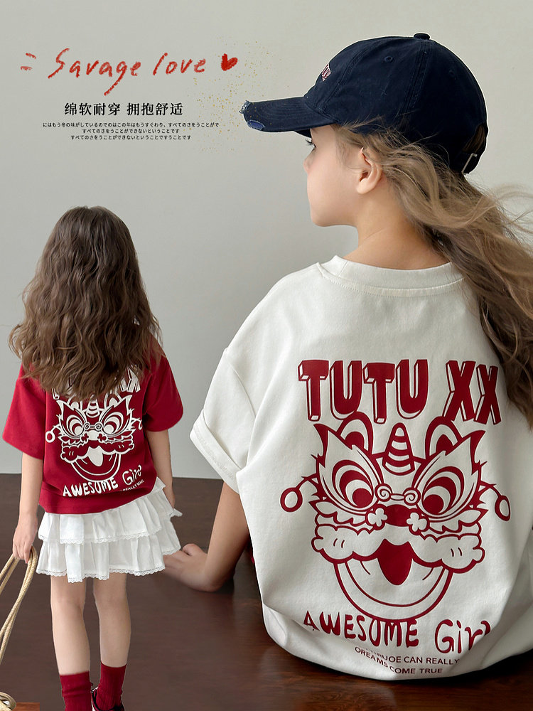 투투 리틀 엘리펀트 여아 티셔츠 2026 봄 신상품 새해 레드 아동 캐주얼 반팔 부모-자녀 베이스 레이어 상의