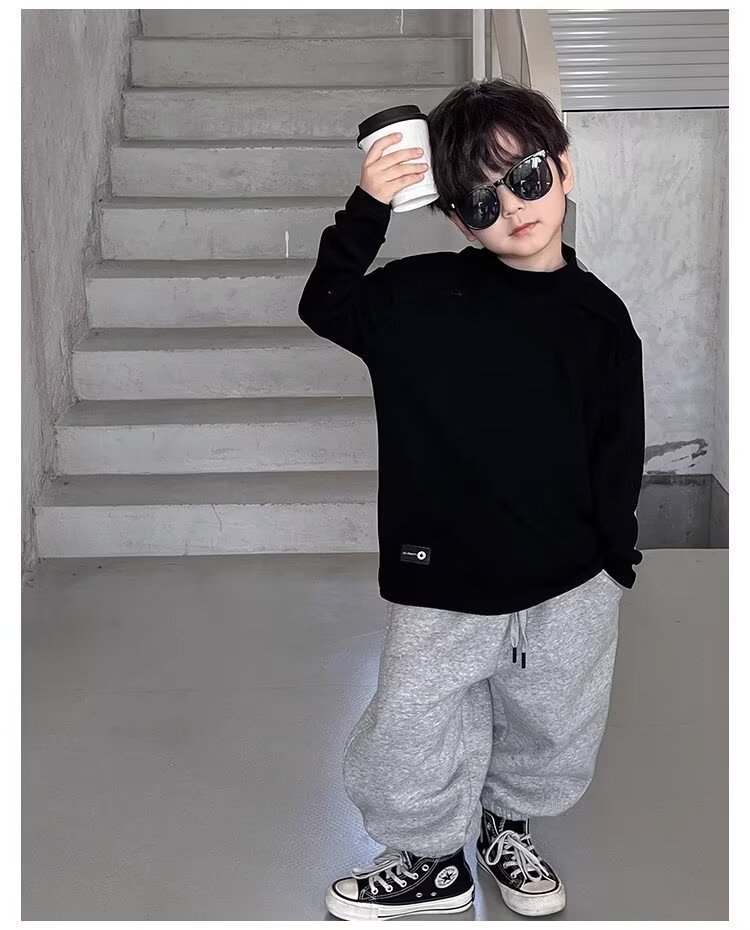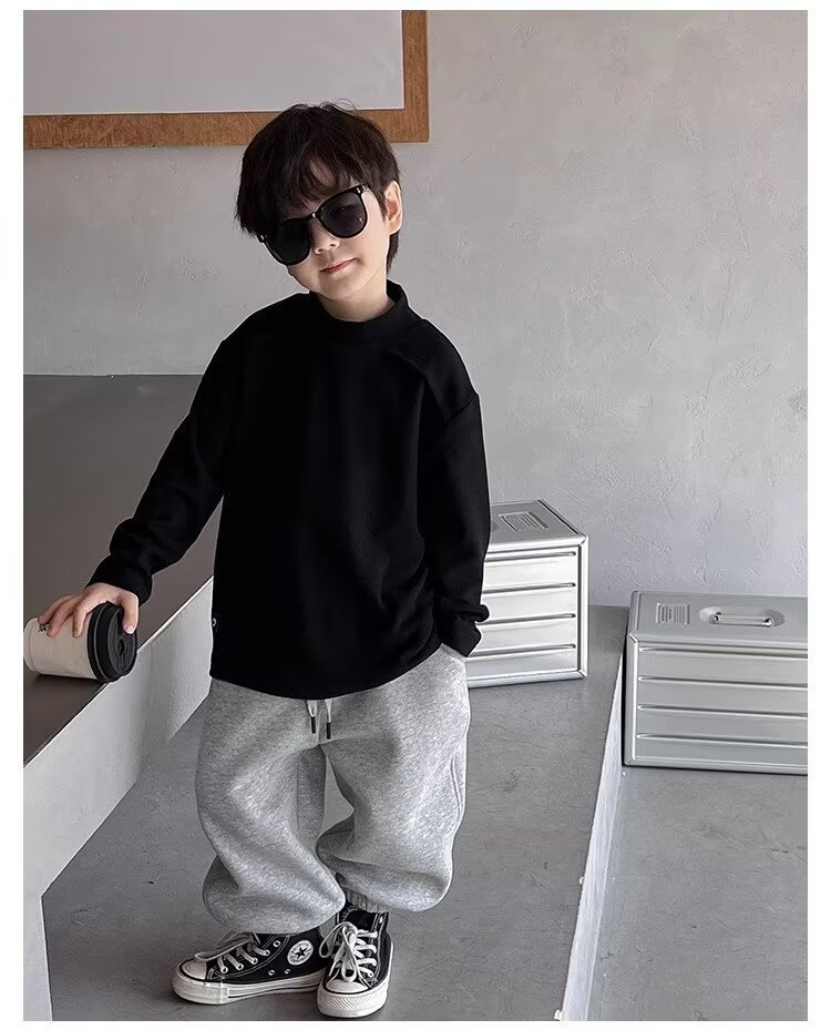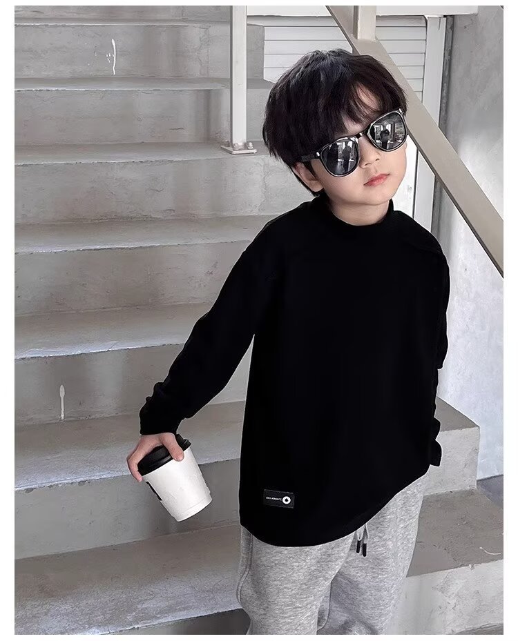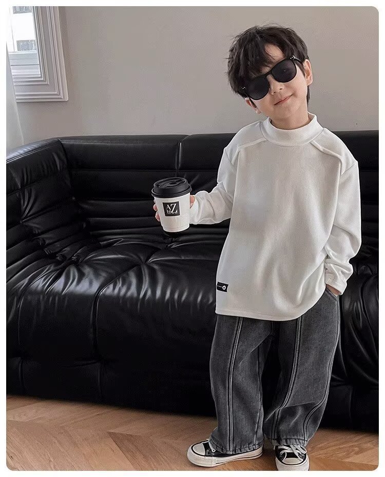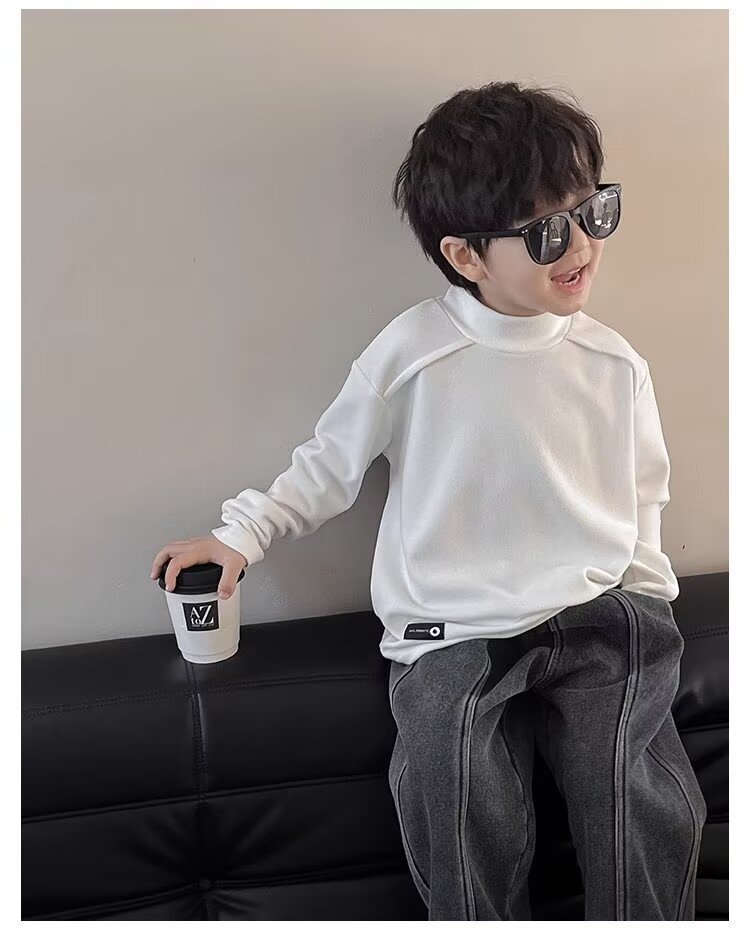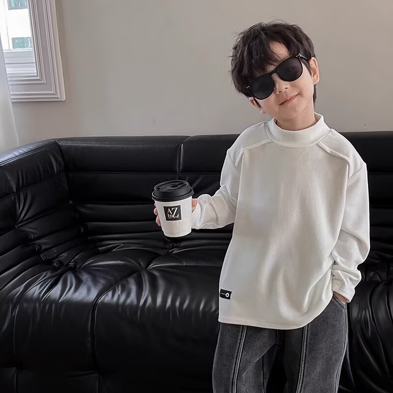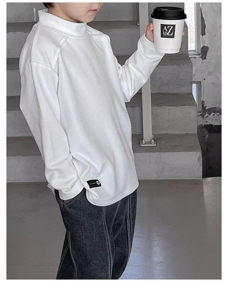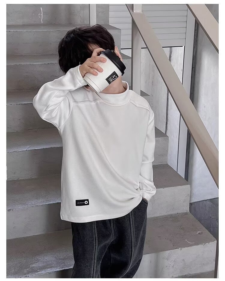 남학생의 흰색 반 높은 칼라베이스 셔츠 2025 새로운 도착 Zhongda 어린이 외부 착용 탑 따뜻한 긴팔 티셔츠스토어 가기