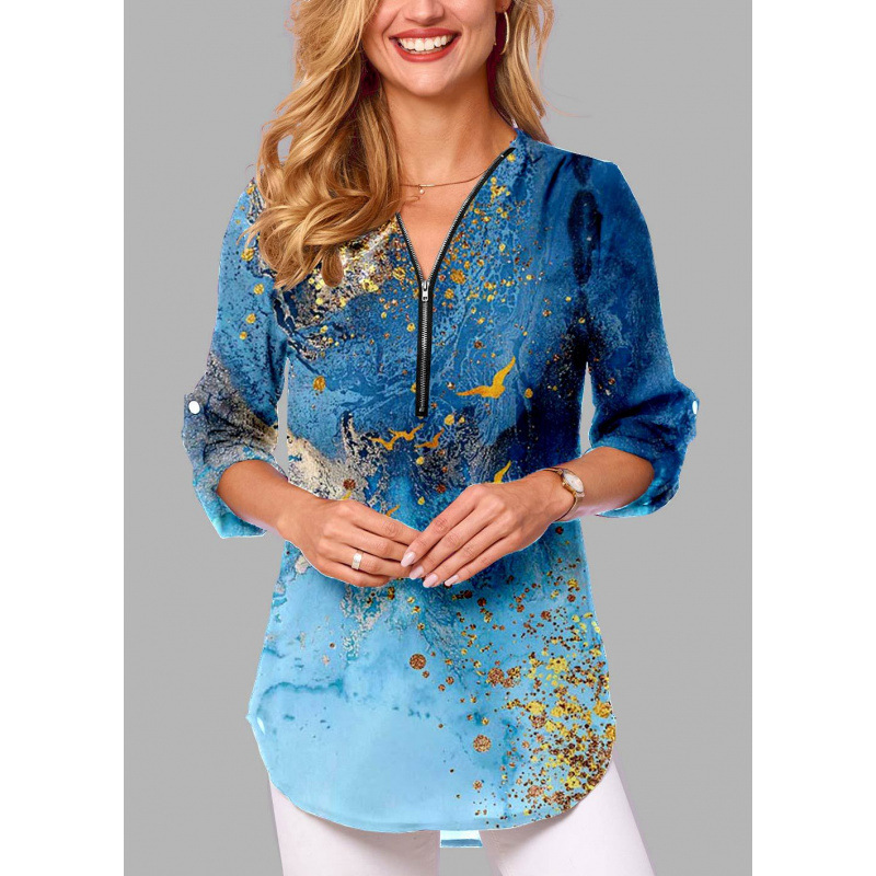 Ebay AliExpress 유럽과 미국의 폭발 V 넥 지퍼 플러스 사이즈 여성용 긴 소매 소매 느슨한 셔츠스토어 가기