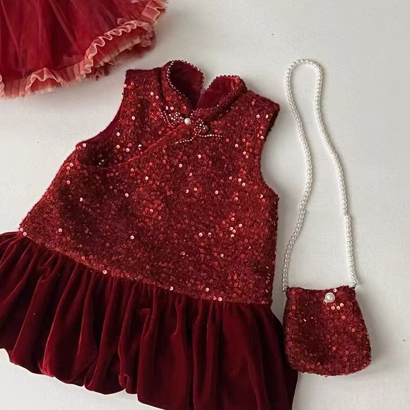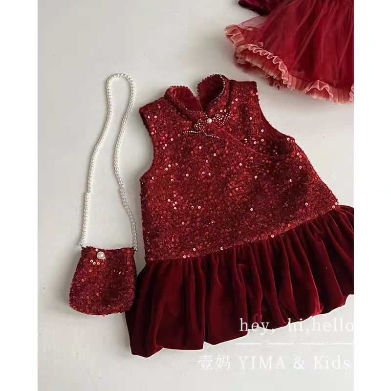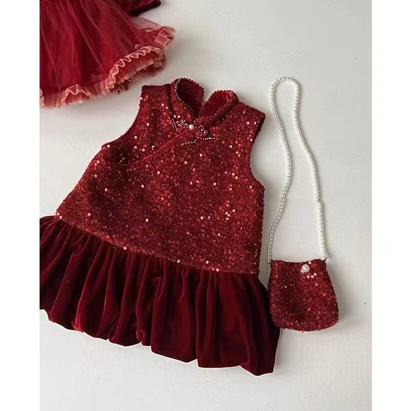 궈펑걸의 새 중국 붉은 원피스 가을 · 겨울 어린이 속편 벨벳 1 세 원피스 청삼 크리스마스 의상