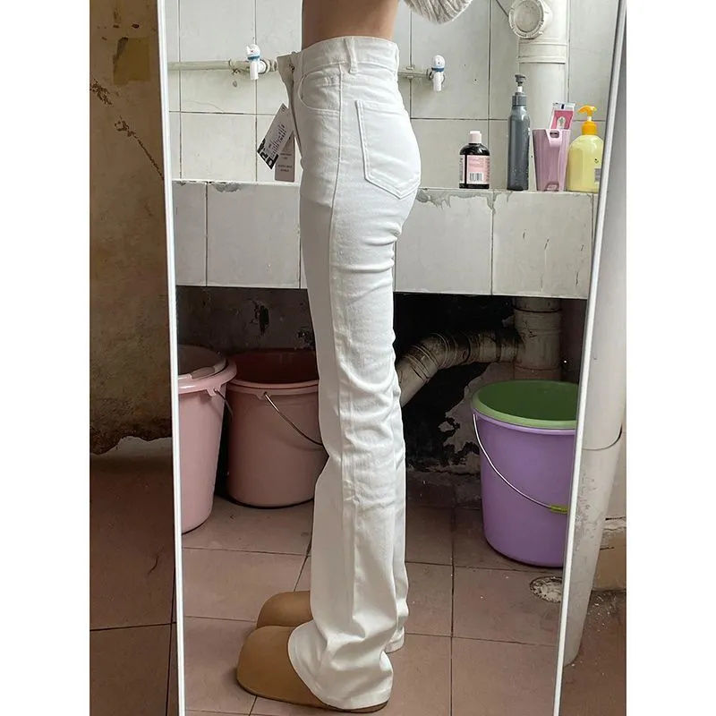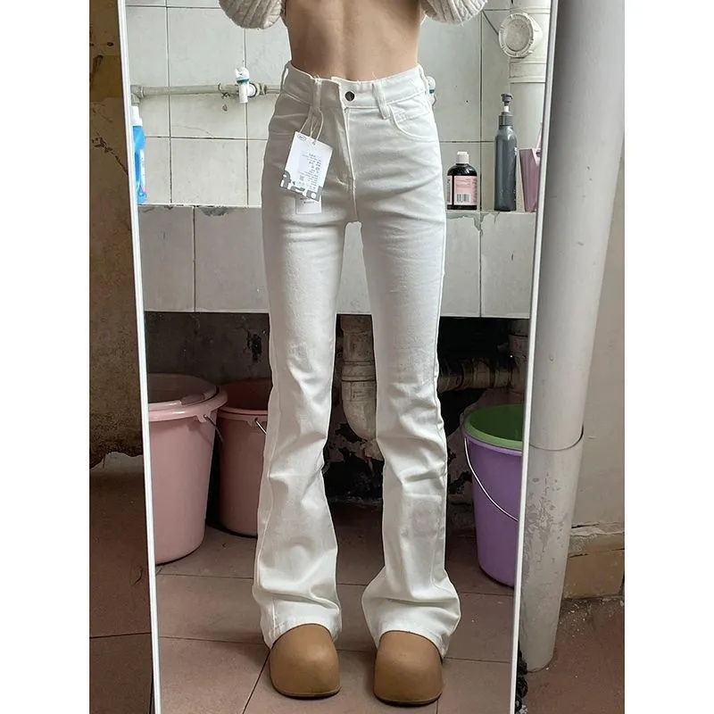 흰색 하이 웨이스트 마이크로 블레 드 청바지 여성의 2024 년 겨울 새 스트레치 슬림 핏 말굽 트럼펫 바지스토어 가기