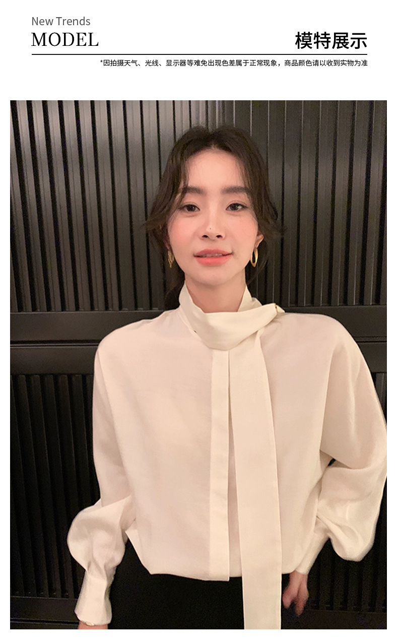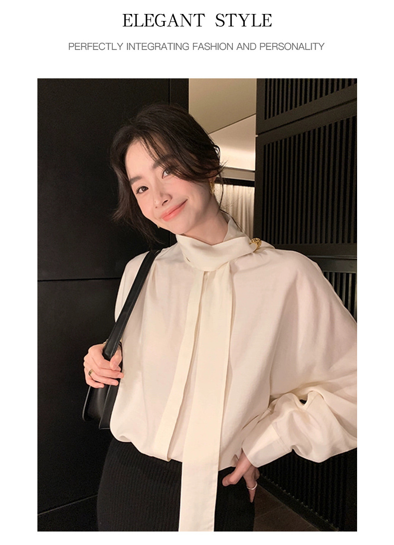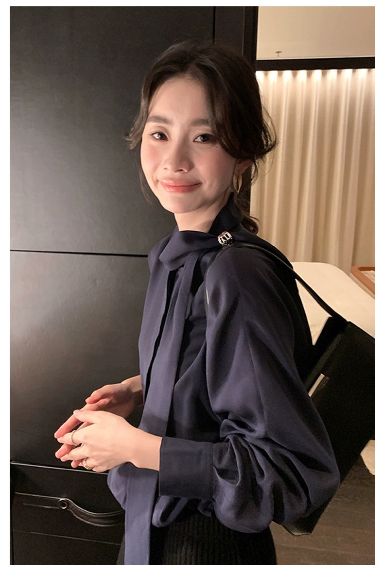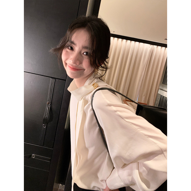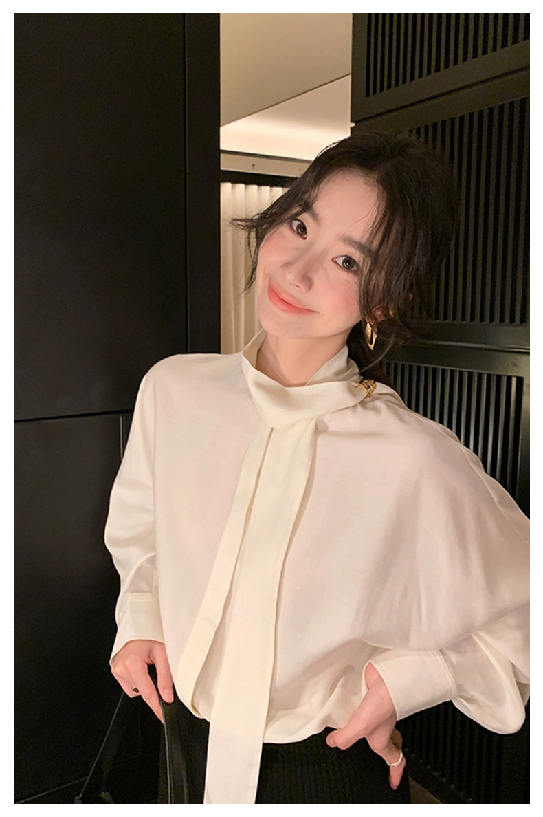 디자인 스카프 칼라 긴팔 솔리드 컬러 셔츠 여성 이른 봄 새로운 스타일 2025 고급 기질 통근 울 탑스토어 가기