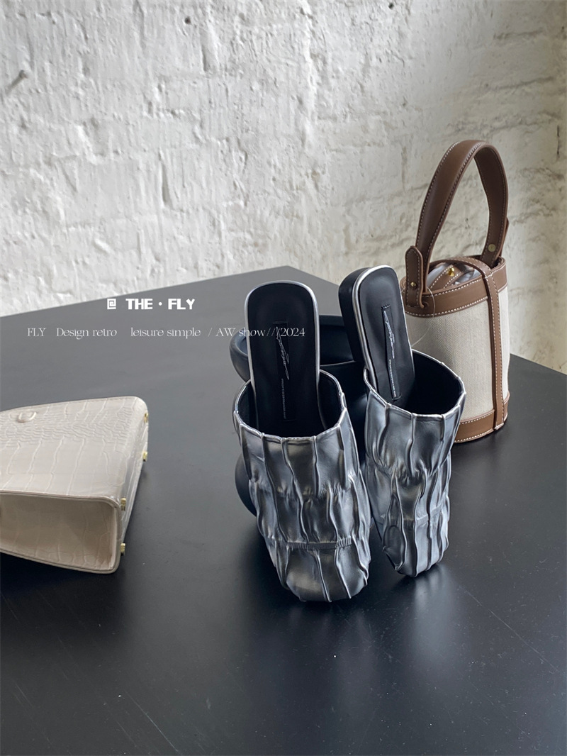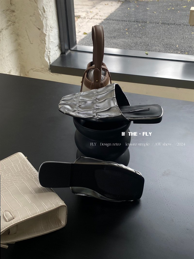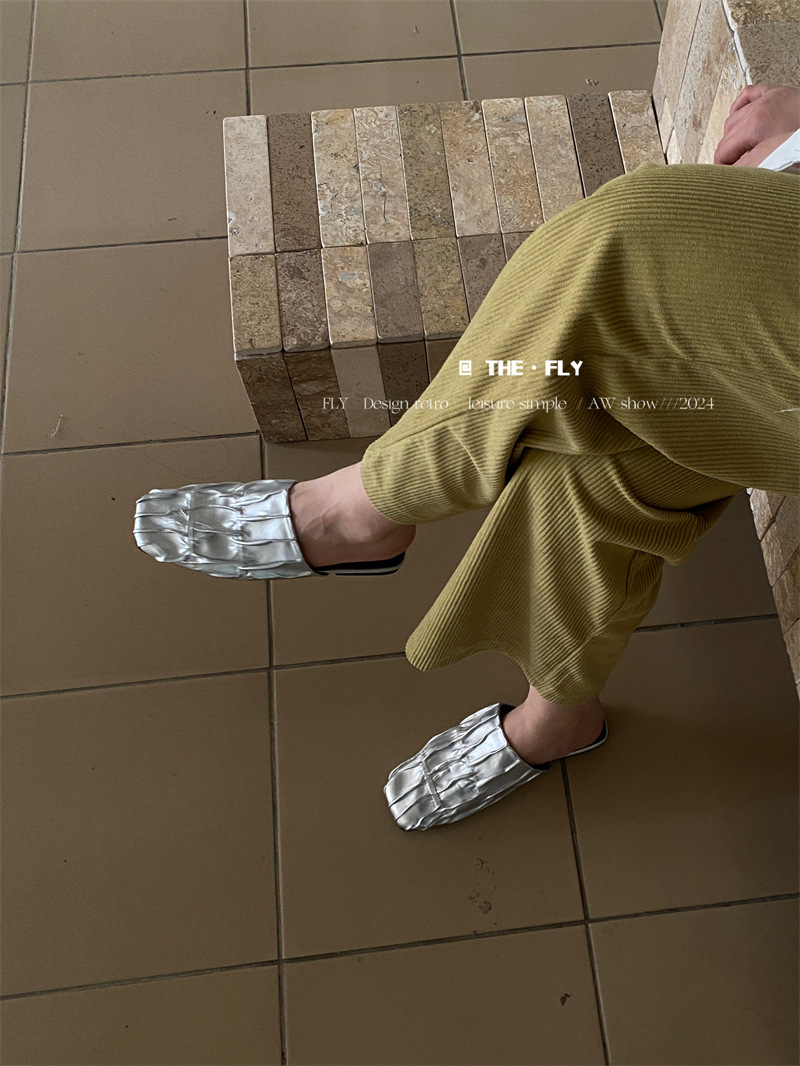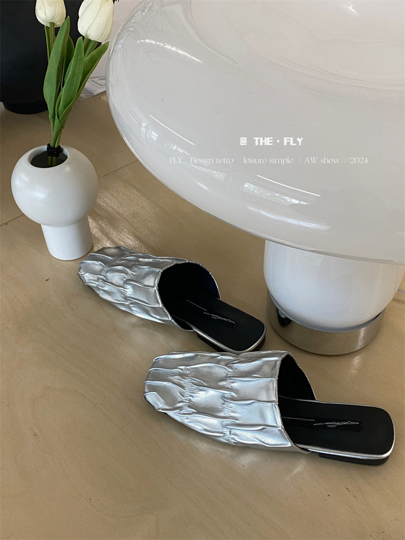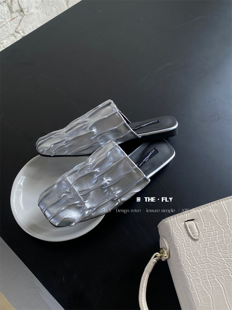 실버 Pleated Baotou 슬리퍼 여성용 플랫 힐 여름 의류 2024 스퀘어 플랫 하프 슬리퍼 뮬러 신발스토어 가기