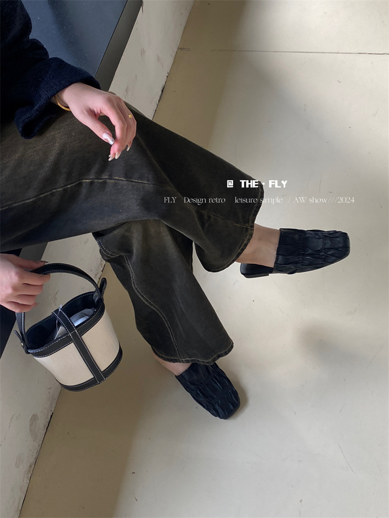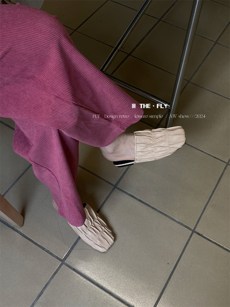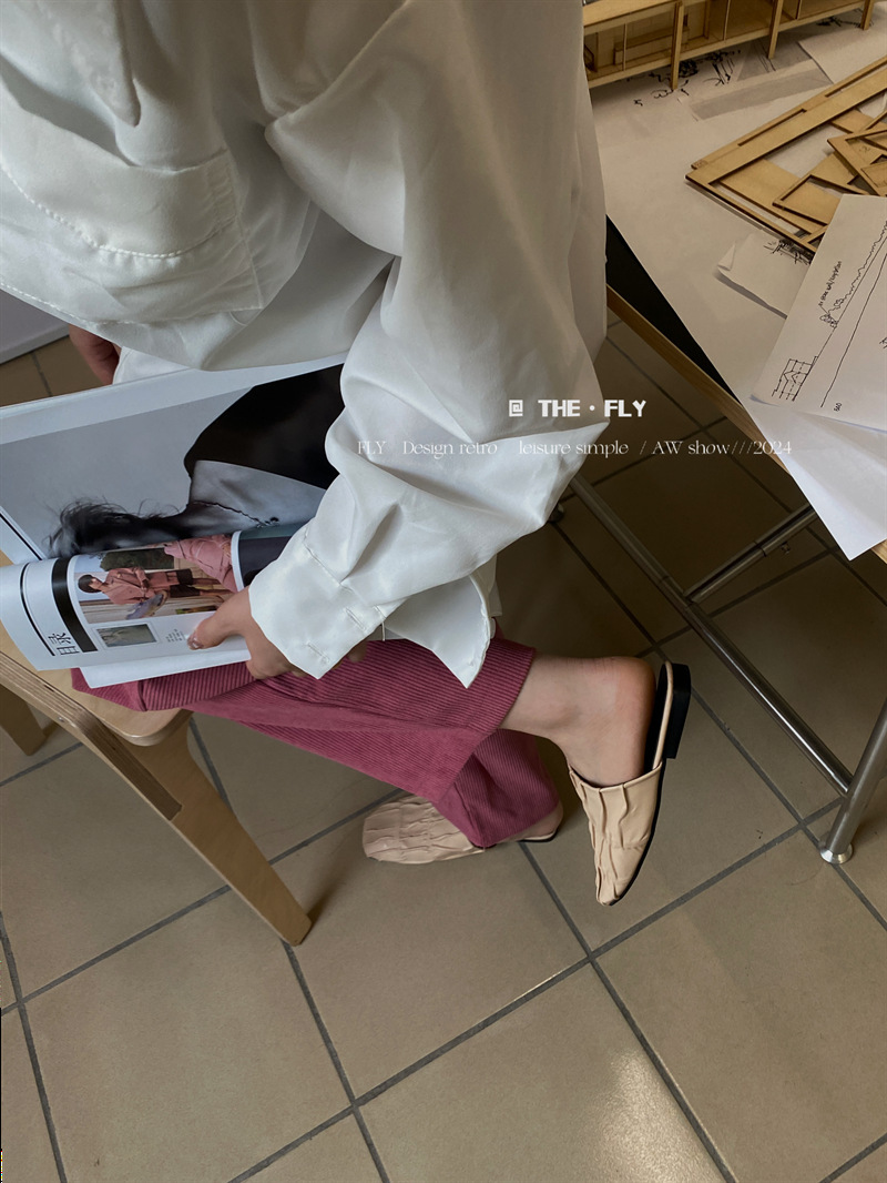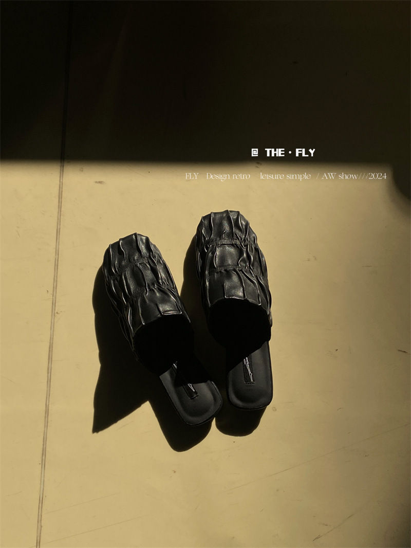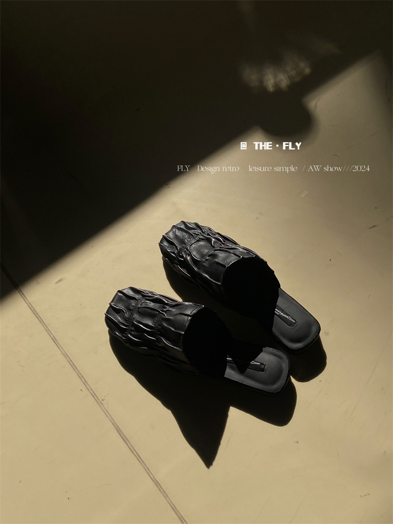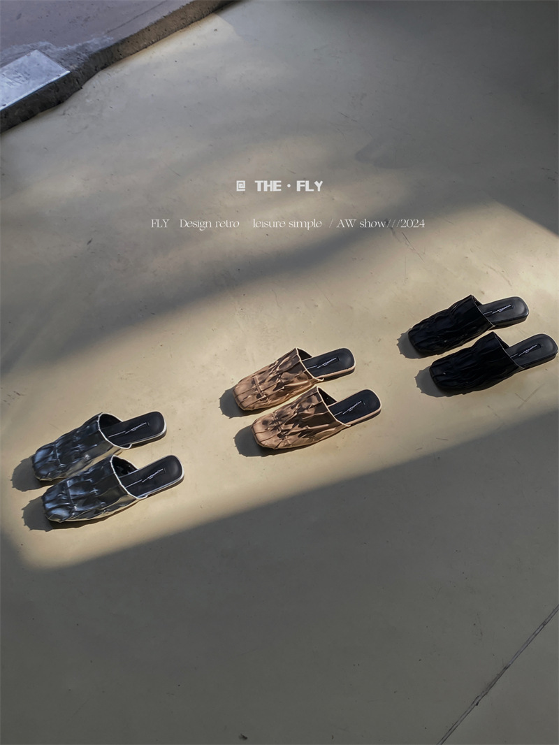 실버 Pleated Baotou 슬리퍼 여성용 플랫 힐 여름 의류 2024 스퀘어 플랫 하프 슬리퍼 뮬러 신발스토어 가기
