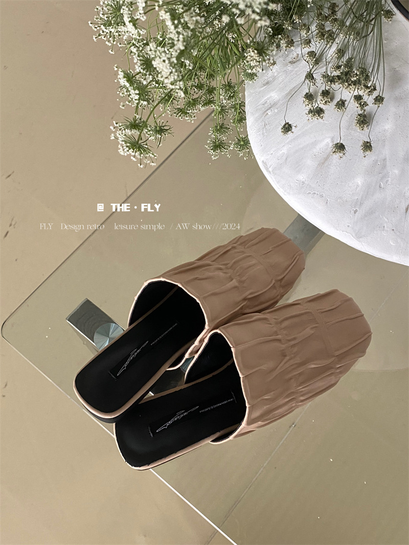 실버 Pleated Baotou 슬리퍼 여성용 플랫 힐 여름 의류 2024 스퀘어 플랫 하프 슬리퍼 뮬러 신발
