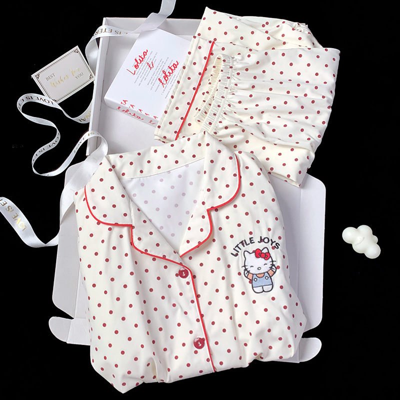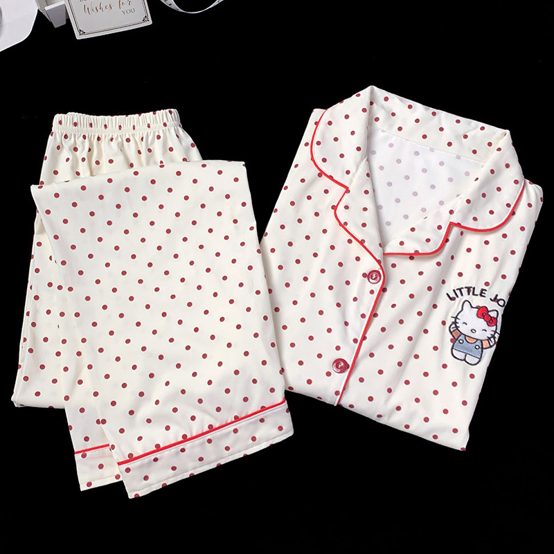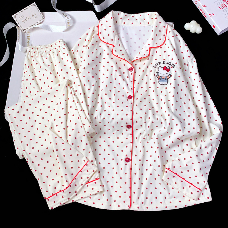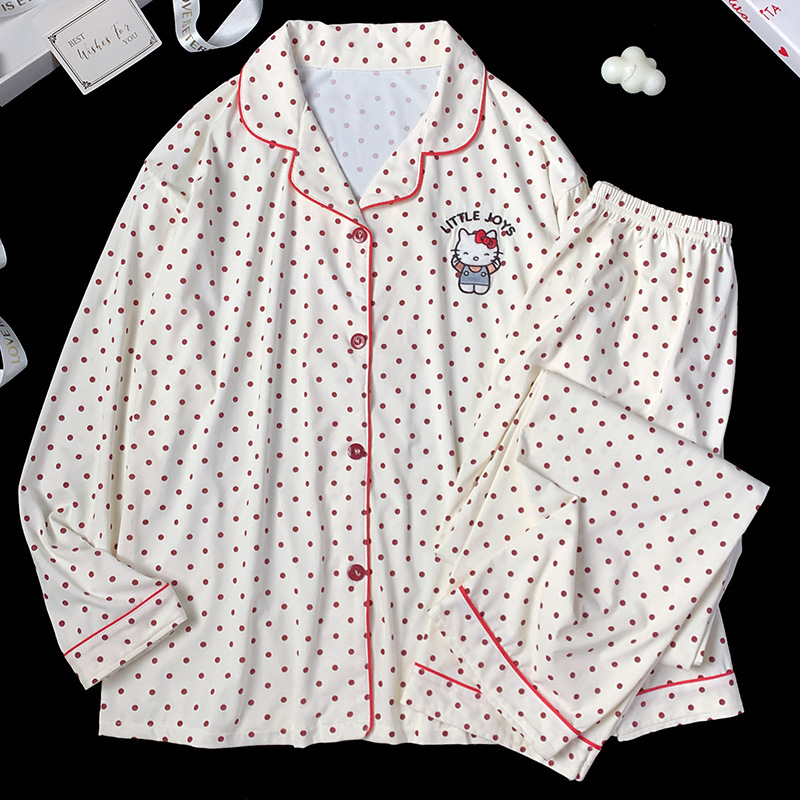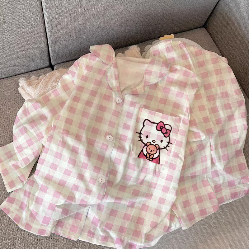 2024 새로운 봄과 가을 긴 소매 파자마 여성 카디건 세트 캐주얼 인터넷 축하 만화 Kt 고양이 달콤한 스타일 홈 옷