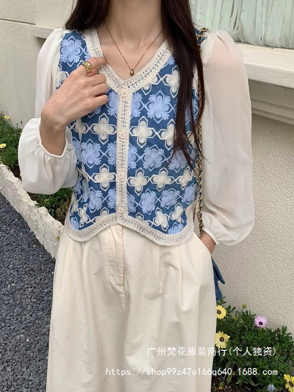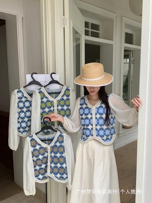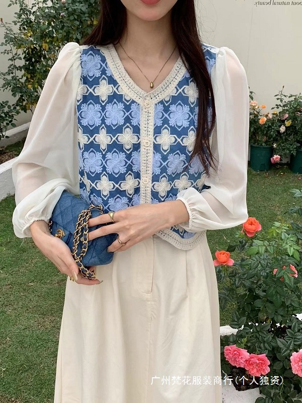한국 패션 콘트라스트 크로 셰 뜨개질 디자인 쉬폰 스티칭 싱글 브레스트 카디건 여성 봄 퍼프 슬리브 쇼트 탑스토어 가기