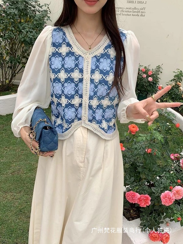한국 패션 콘트라스트 크로 셰 뜨개질 디자인 쉬폰 스티칭 싱글 브레스트 카디건 여성 봄 퍼프 슬리브 쇼트 탑
