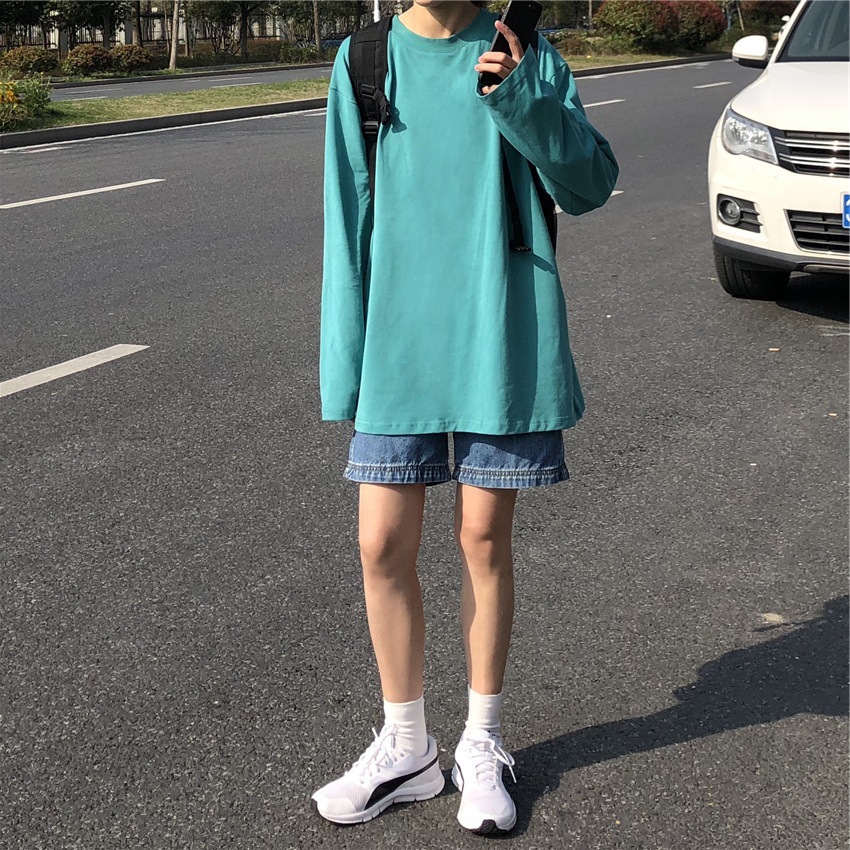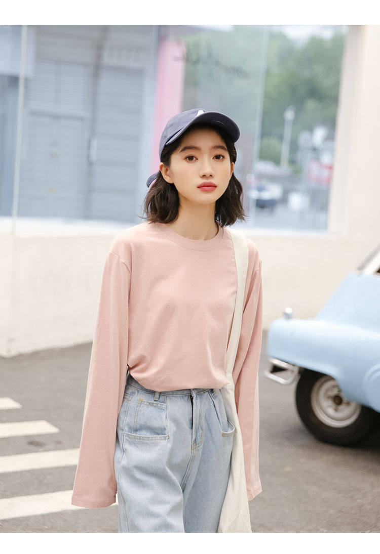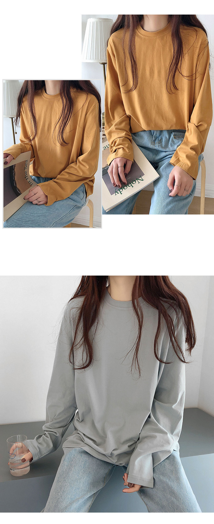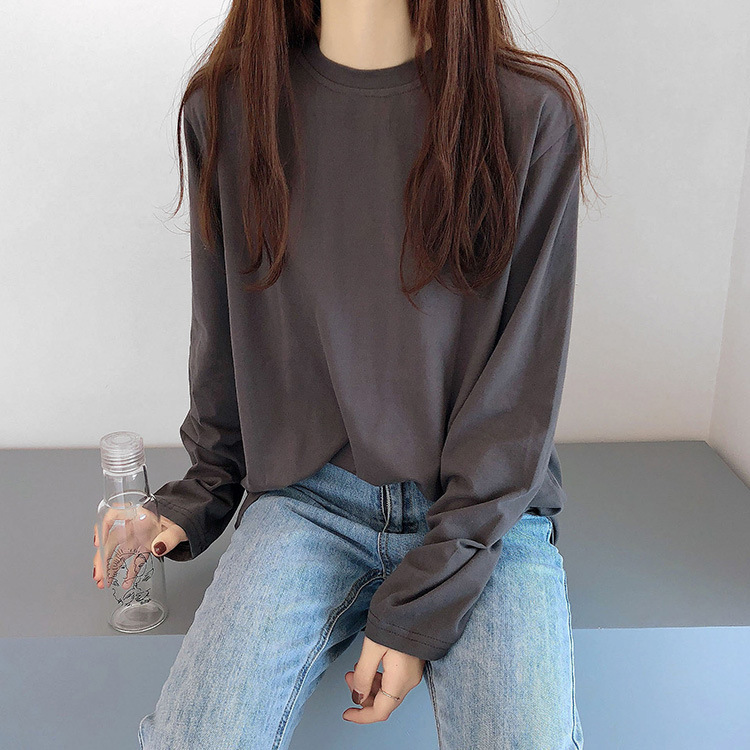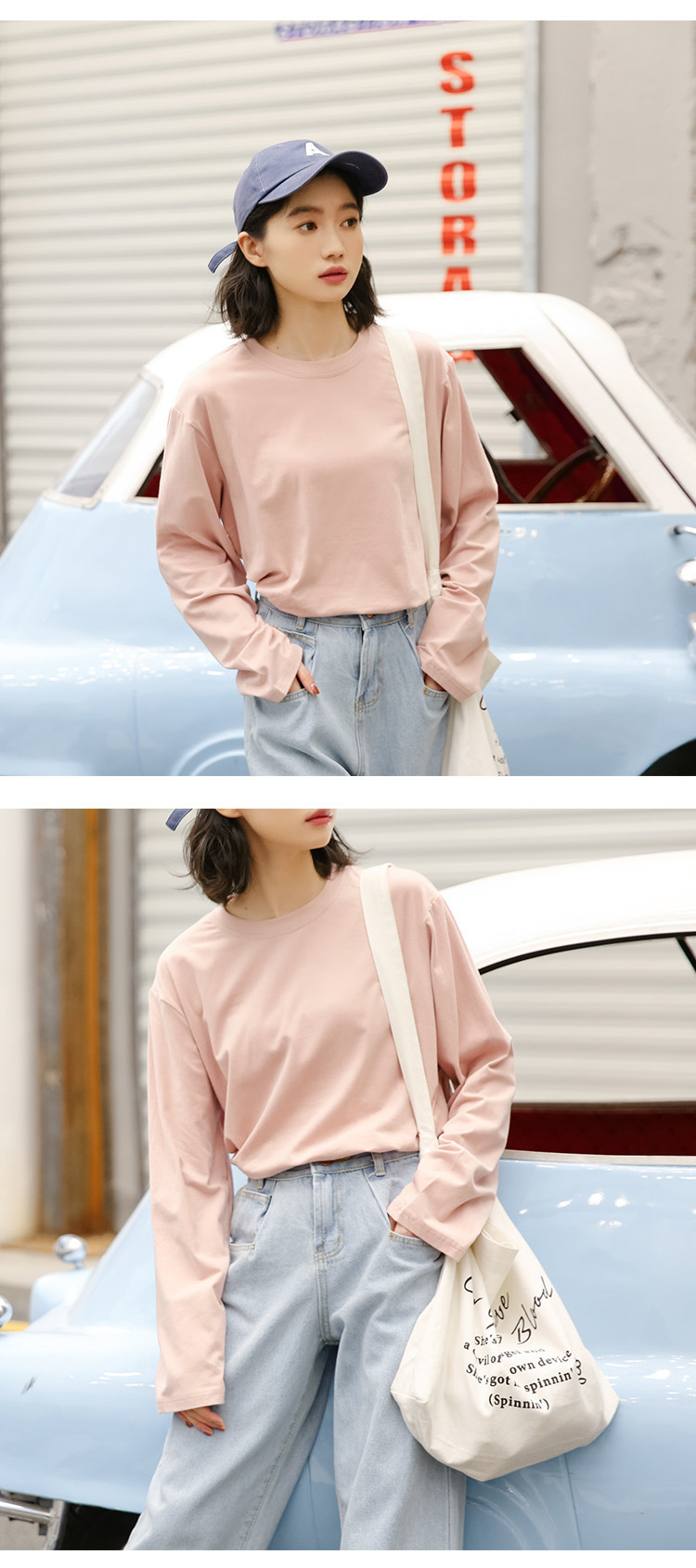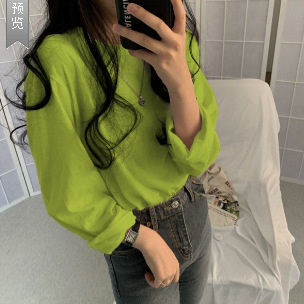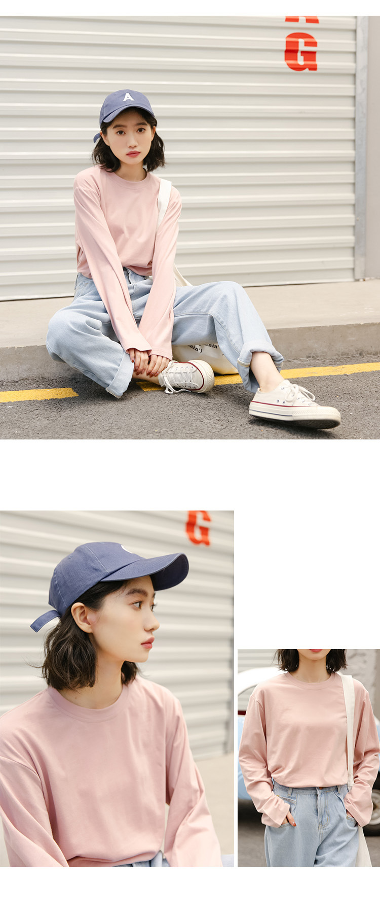신유 한국식 멀티 컬러 칼리지 스타일 루즈 티셔츠 여성 봄과 가을 새 긴 소매 내부 둥근 목 T베이스 셔츠 여성용 의류스토어 가기