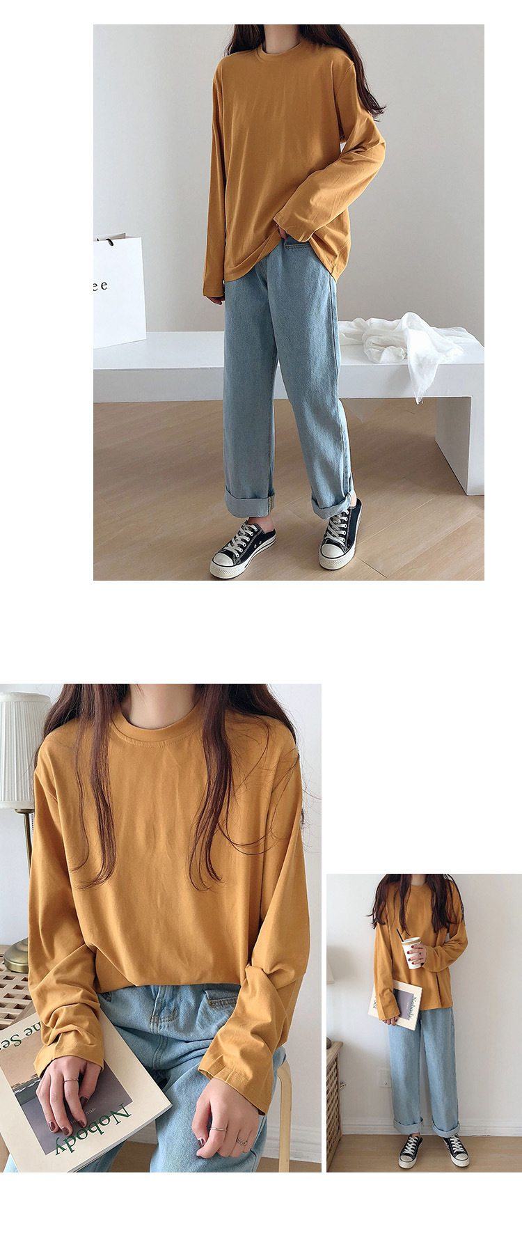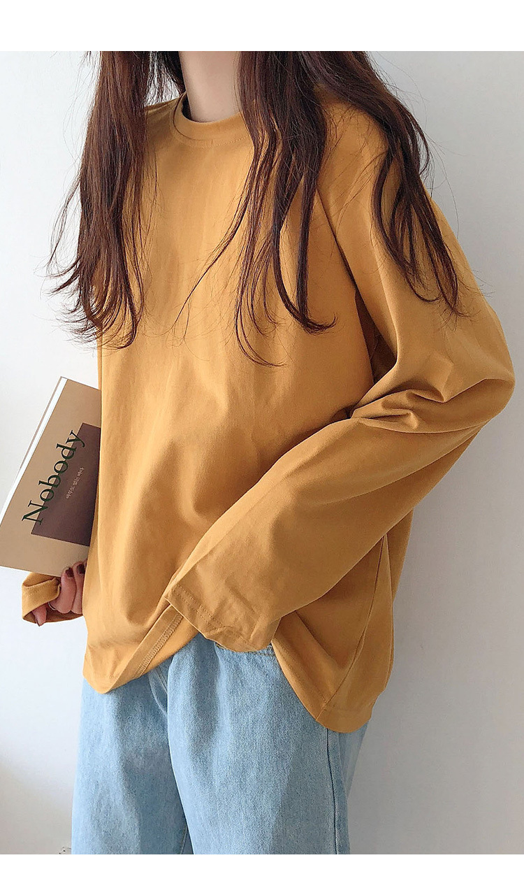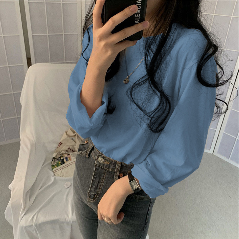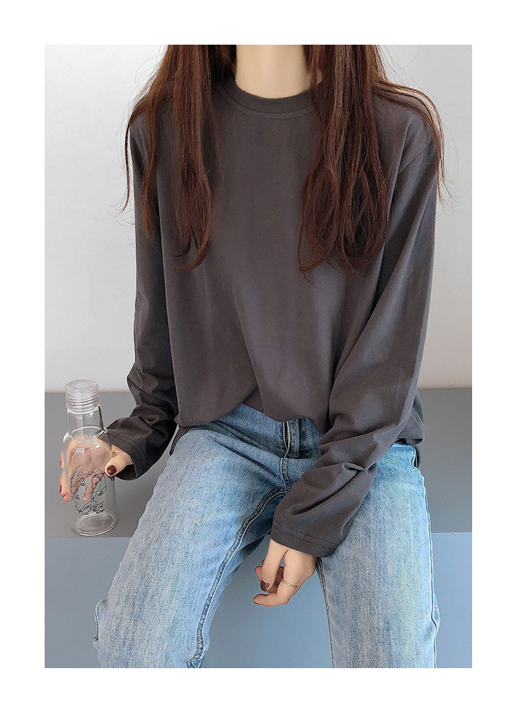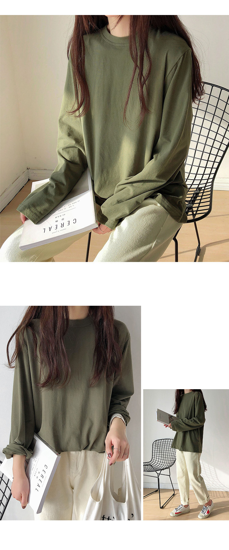 신유 한국식 멀티 컬러 칼리지 스타일 루즈 티셔츠 여성 봄과 가을 새 긴 소매 내부 둥근 목 T베이스 셔츠 여성용 의류스토어 가기