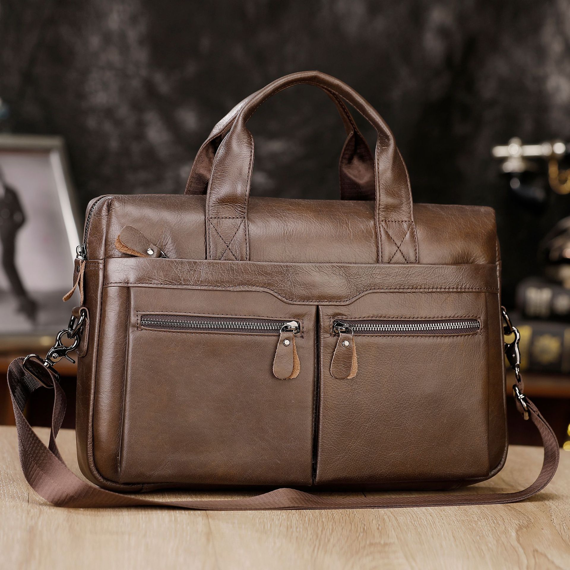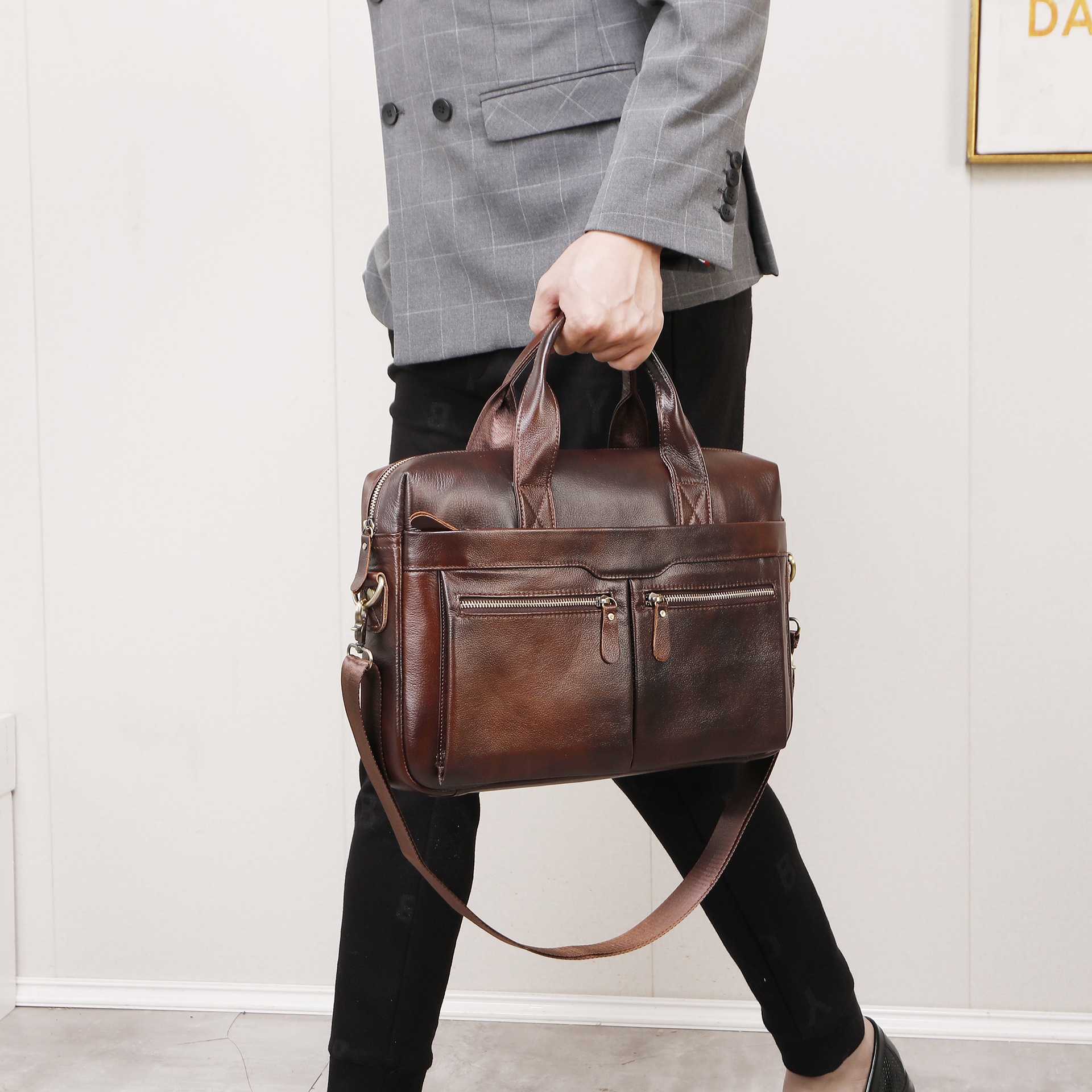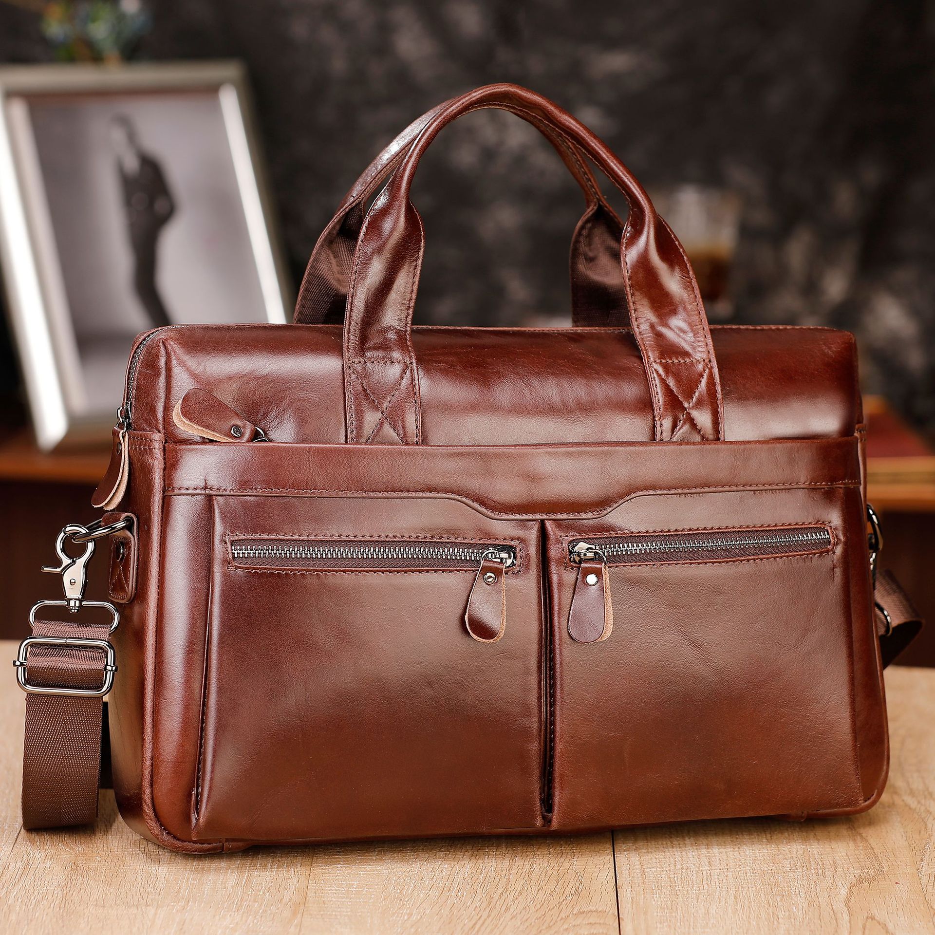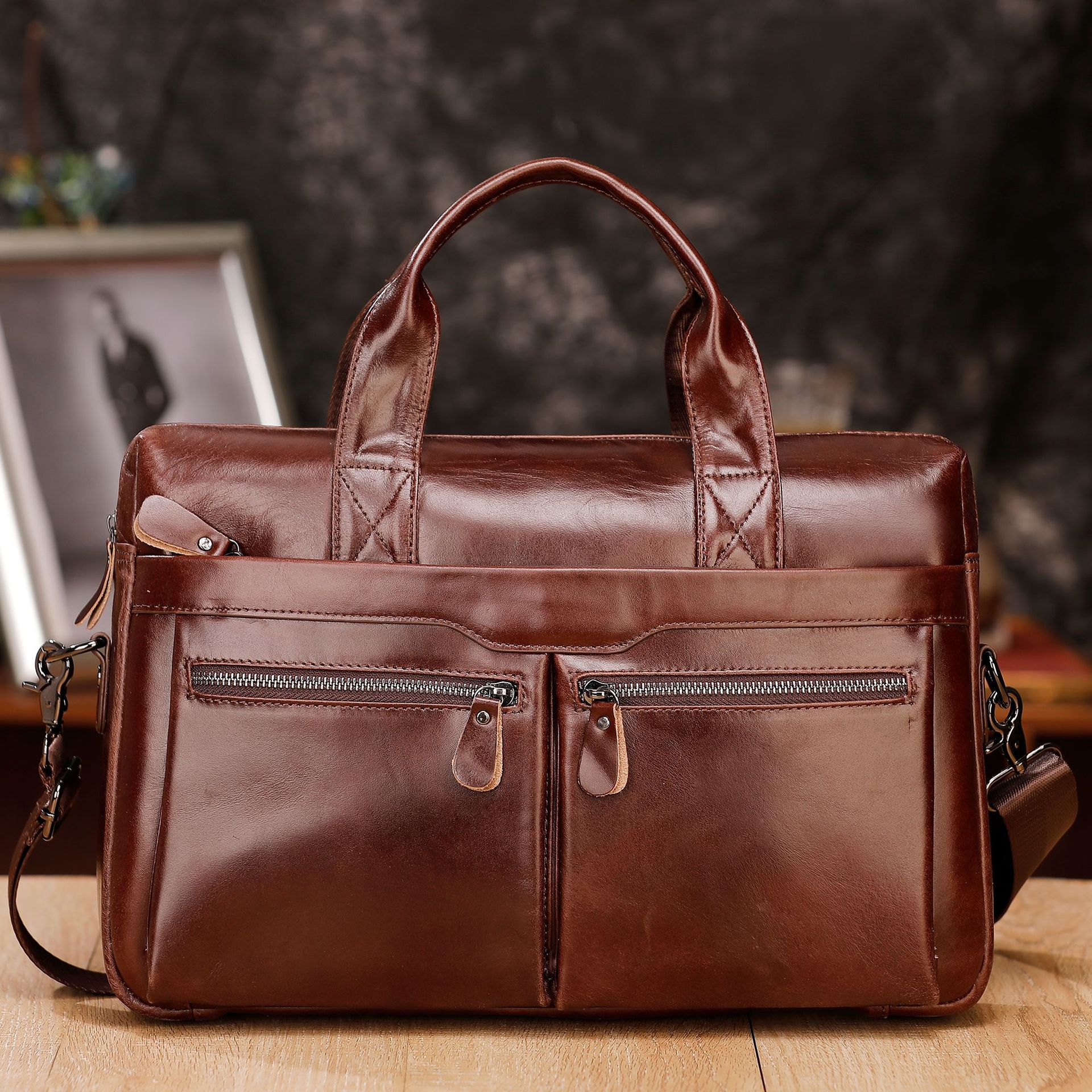 탑 레이어 Cowhide 비즈니스 서류 가방 어깨 크로스 바디 남성 가방 유행 캐주얼 노트북 15.6 인치 컴퓨터 핸드백스토어 가기