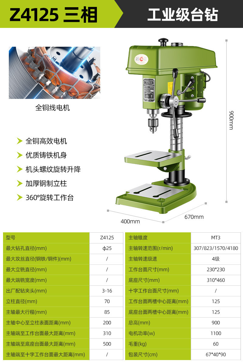 • Z4125 벤치 드릴 [3상 380V] 1100W 전체 구리선