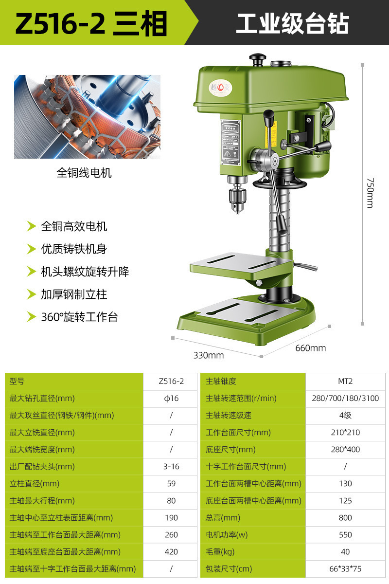 • Z516-2 벤치 드릴 [3상 380V] 550W 전체 구리선