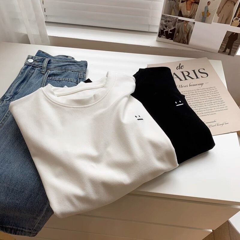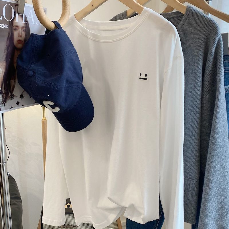 봄과 가을 새로운 느슨한 슬리밍 화이트 스마일리 긴 소매 라운드 넥 블랙 스타일리스트 탑 베이스 셔츠 여성용 티셔츠스토어 가기