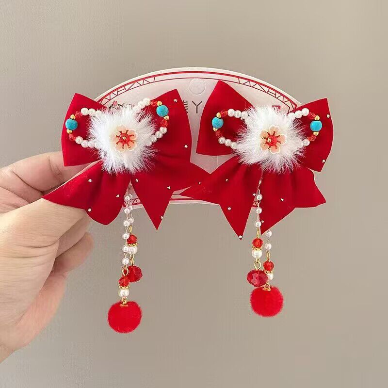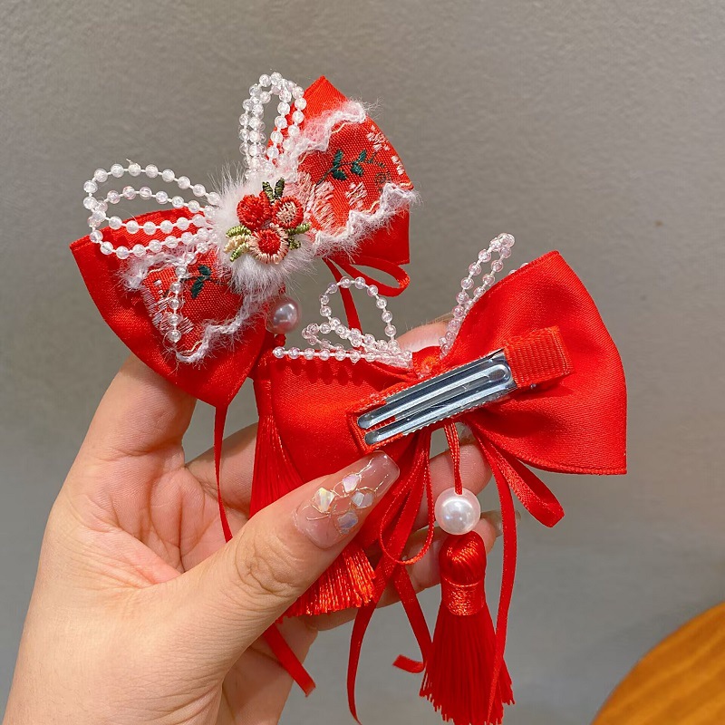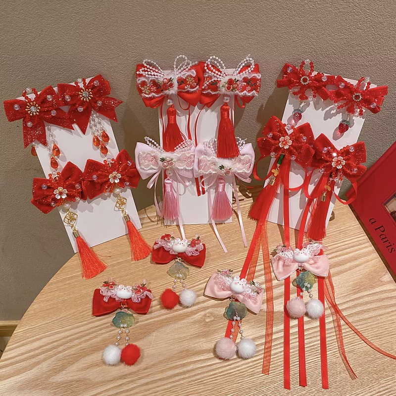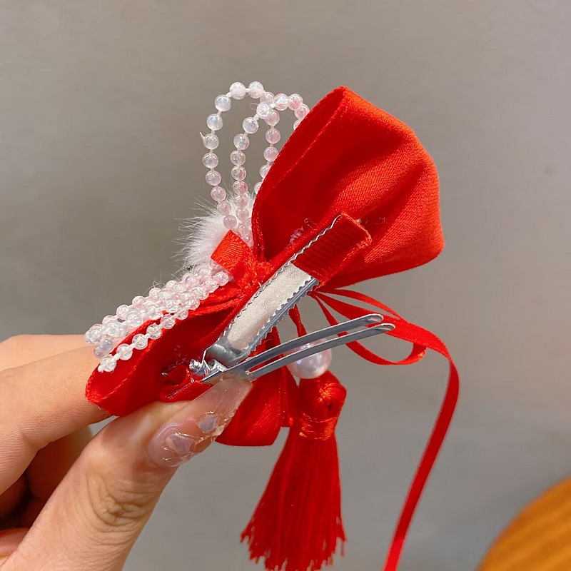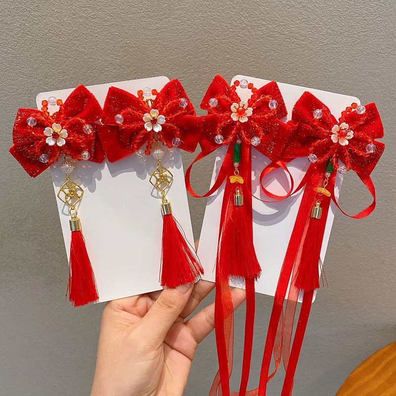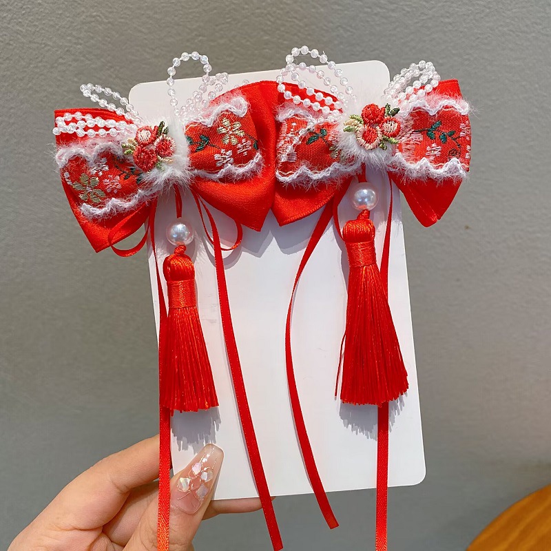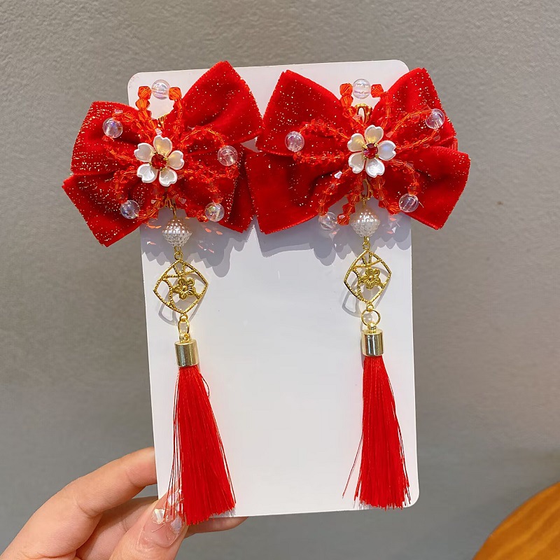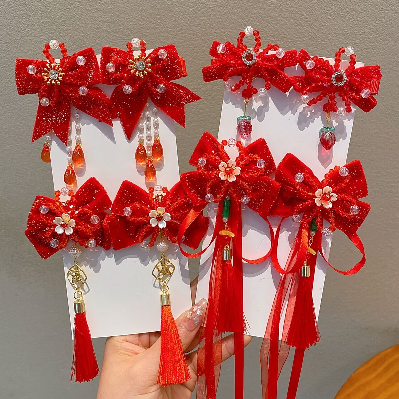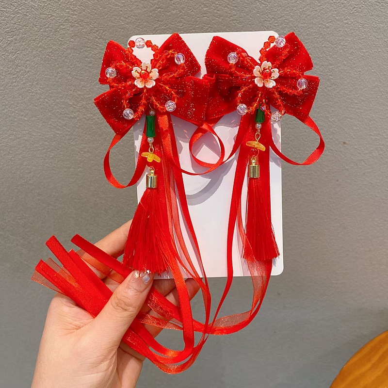 어린이 골동품 헤어 액세서리 중국 스타일 웨딩 축제 헤어 액세서리 레드 보우 술 헤어 카드 걸스 한푸 헤드폰