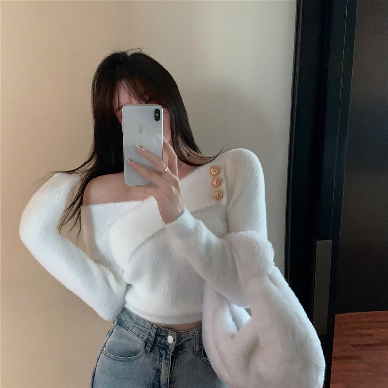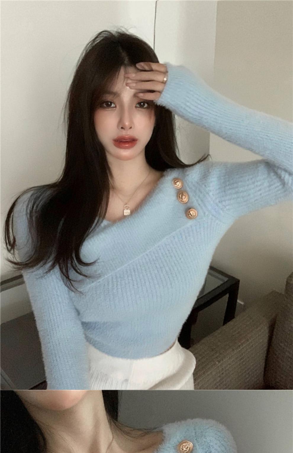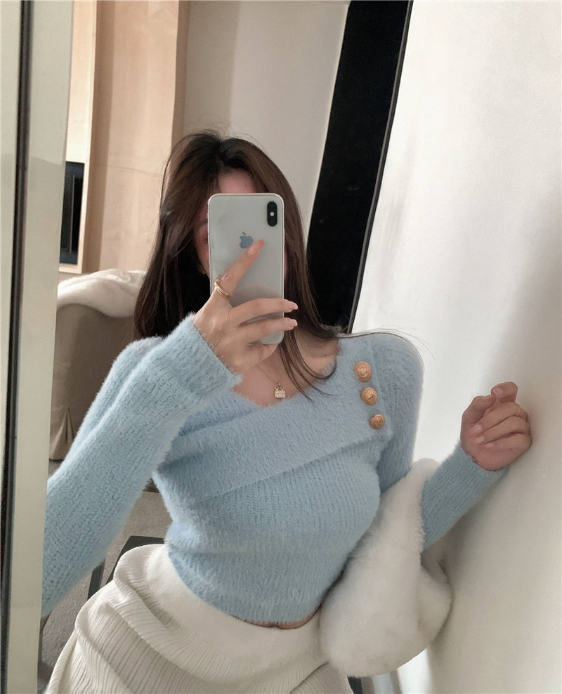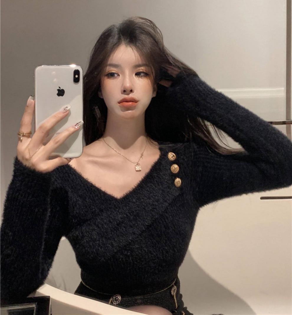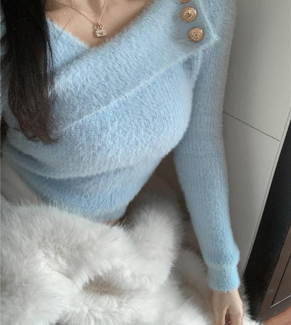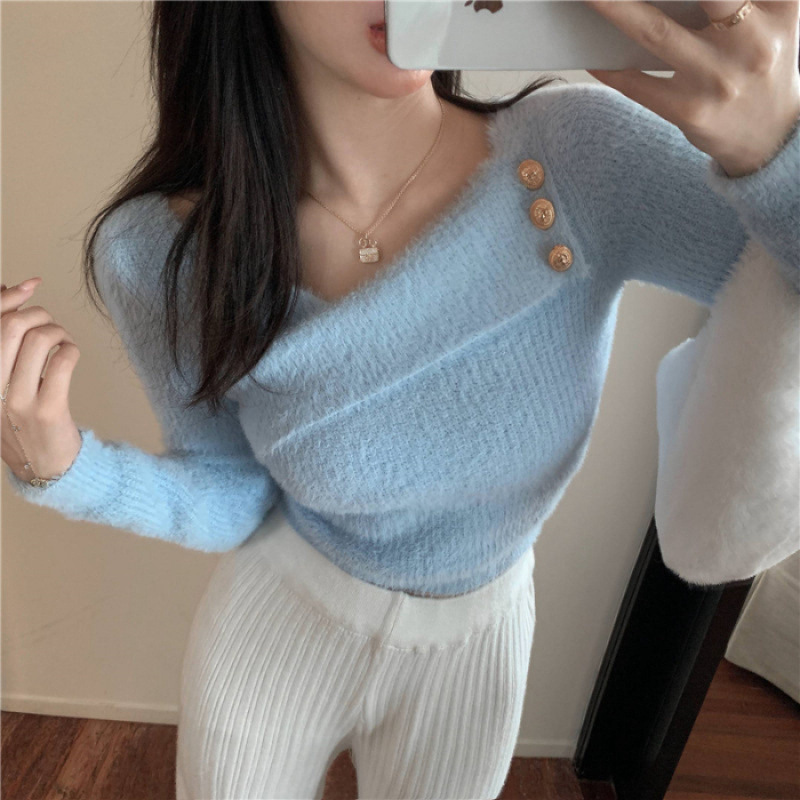 순수 모조 밍크 양털 슬림핏 긴팔 니트 스웨터 여성용 봄과 가을 뉴 크로스 V 넥 쇼트 스웨터베이스 셔츠 탑스토어 가기
