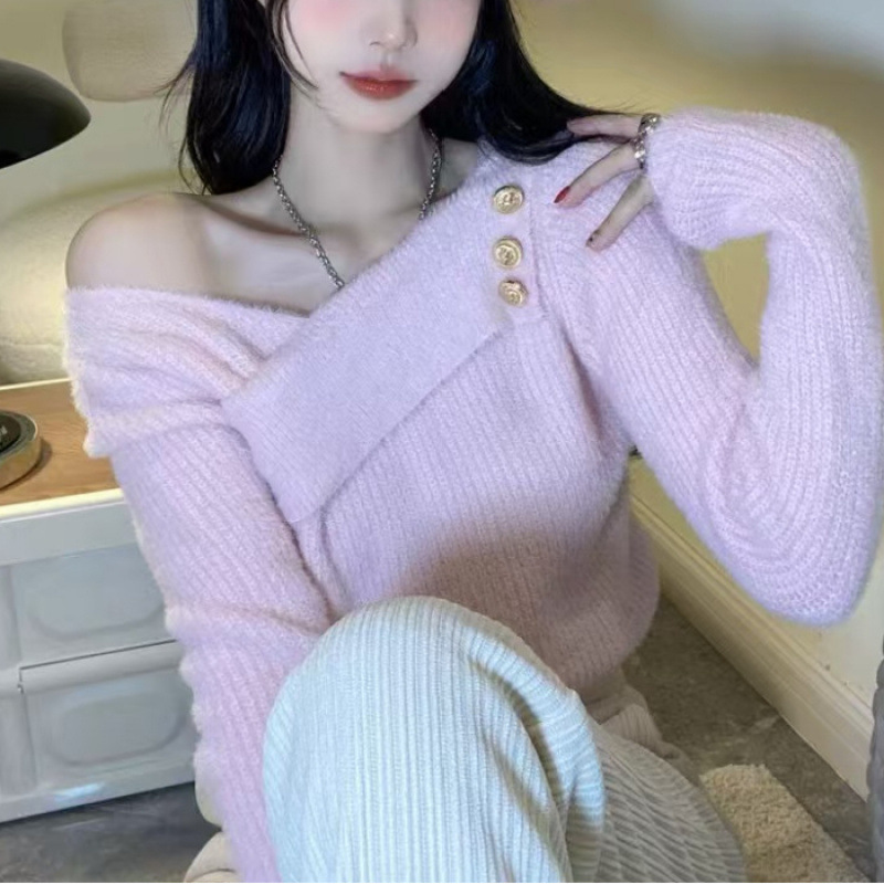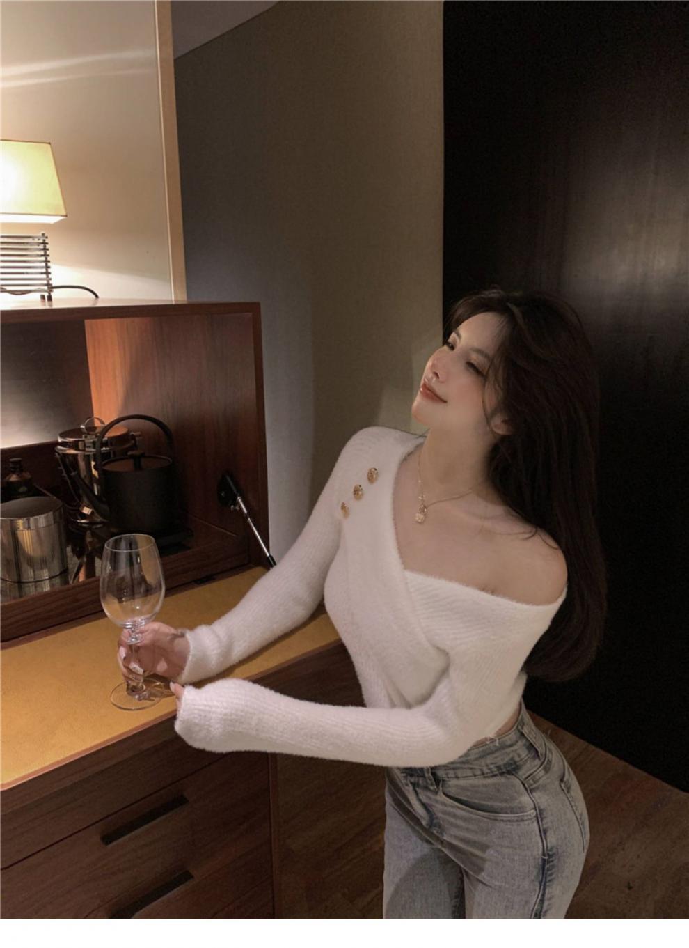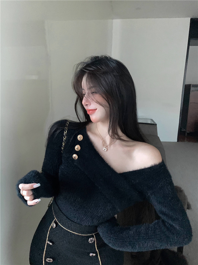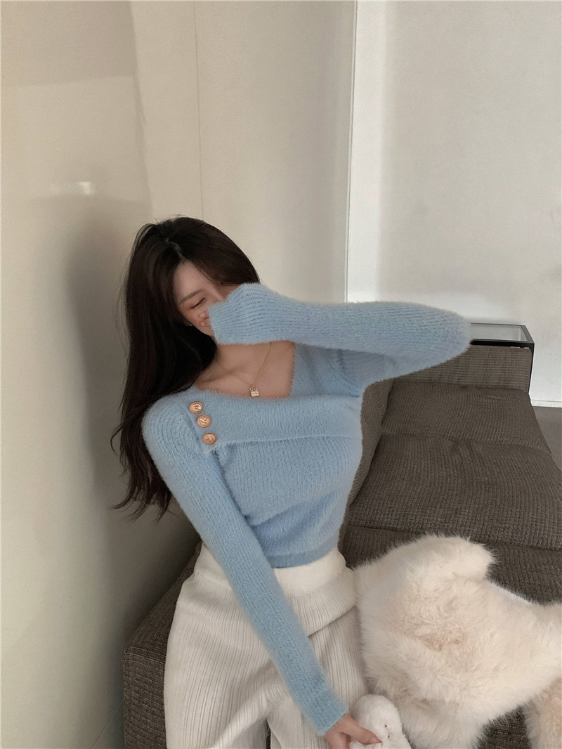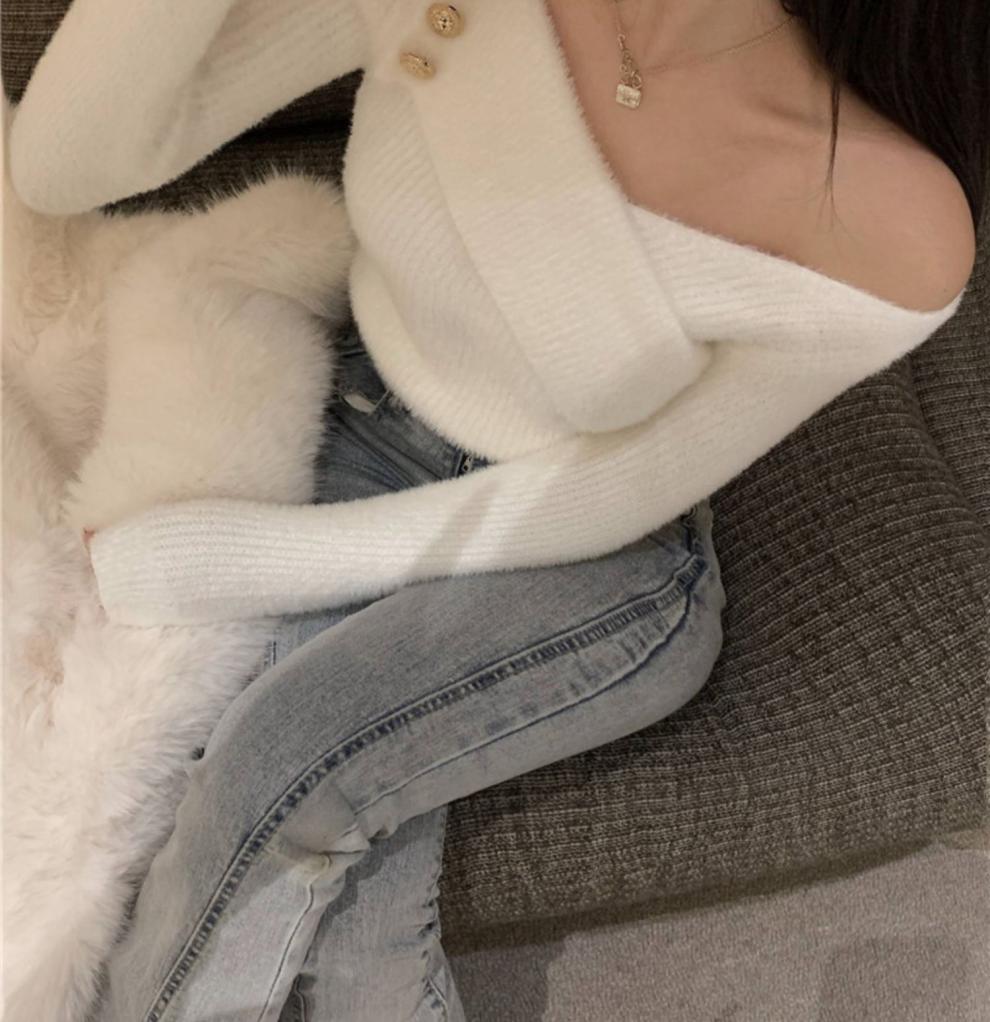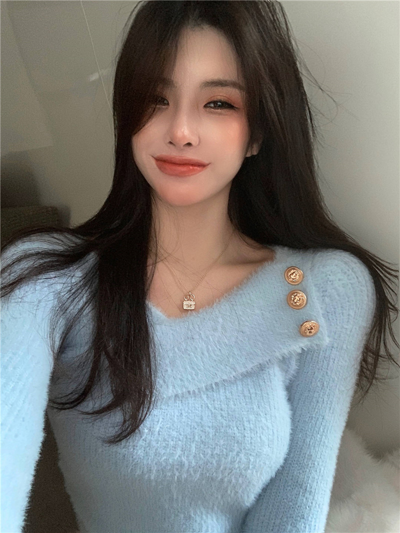 순수 모조 밍크 양털 슬림핏 긴팔 니트 스웨터 여성용 봄과 가을 뉴 크로스 V 넥 쇼트 스웨터베이스 셔츠 탑스토어 가기