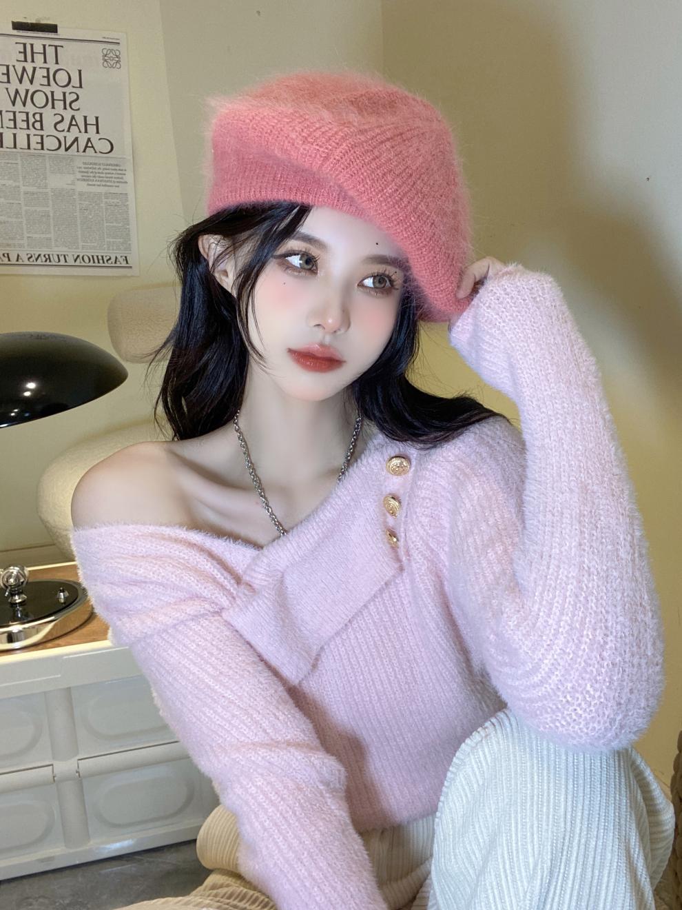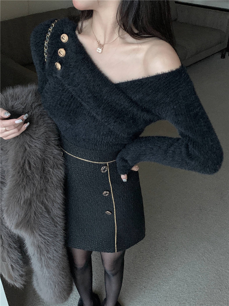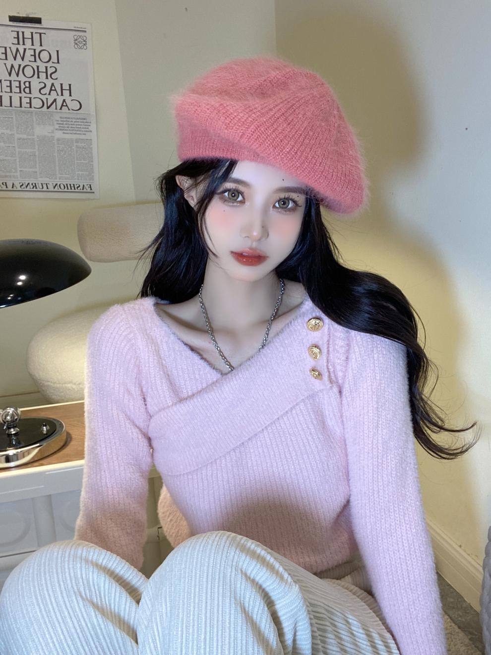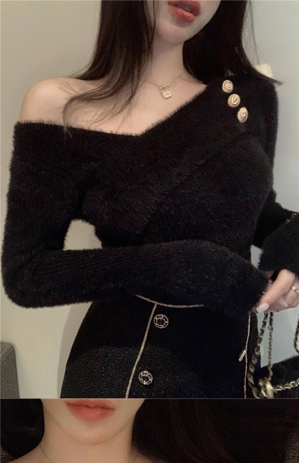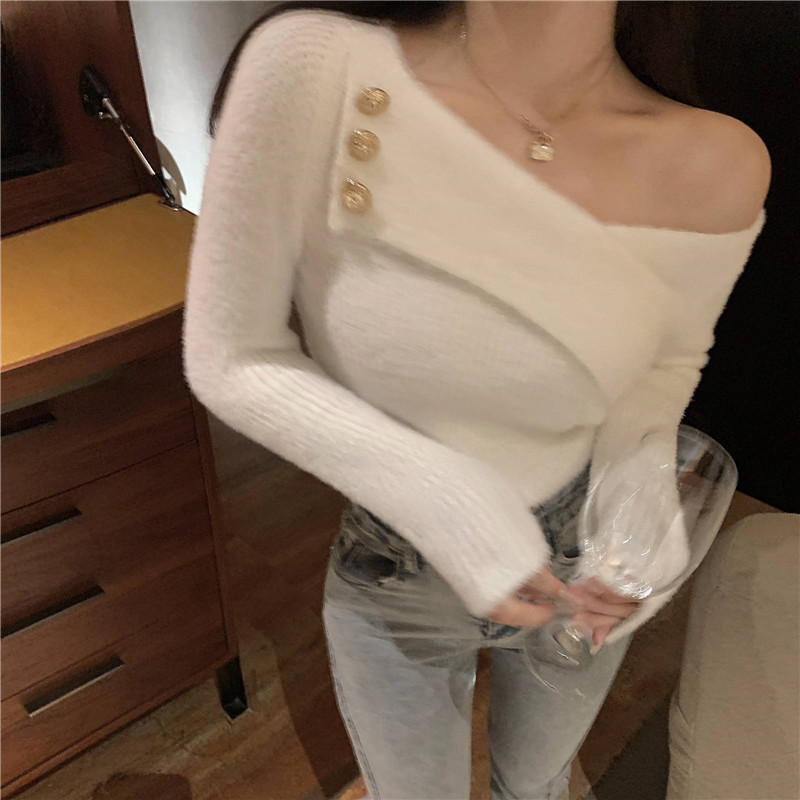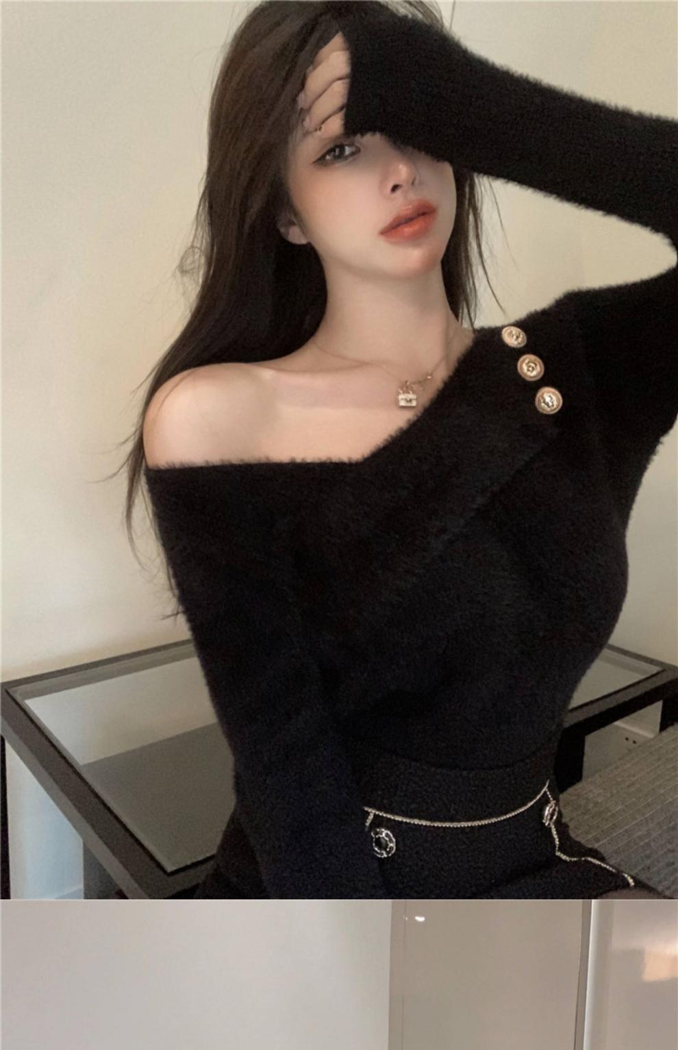 순수 모조 밍크 양털 슬림핏 긴팔 니트 스웨터 여성용 봄과 가을 뉴 크로스 V 넥 쇼트 스웨터베이스 셔츠 탑스토어 가기
