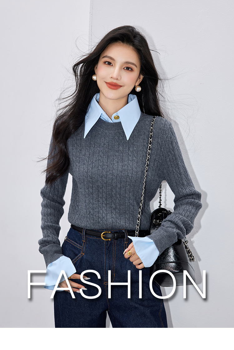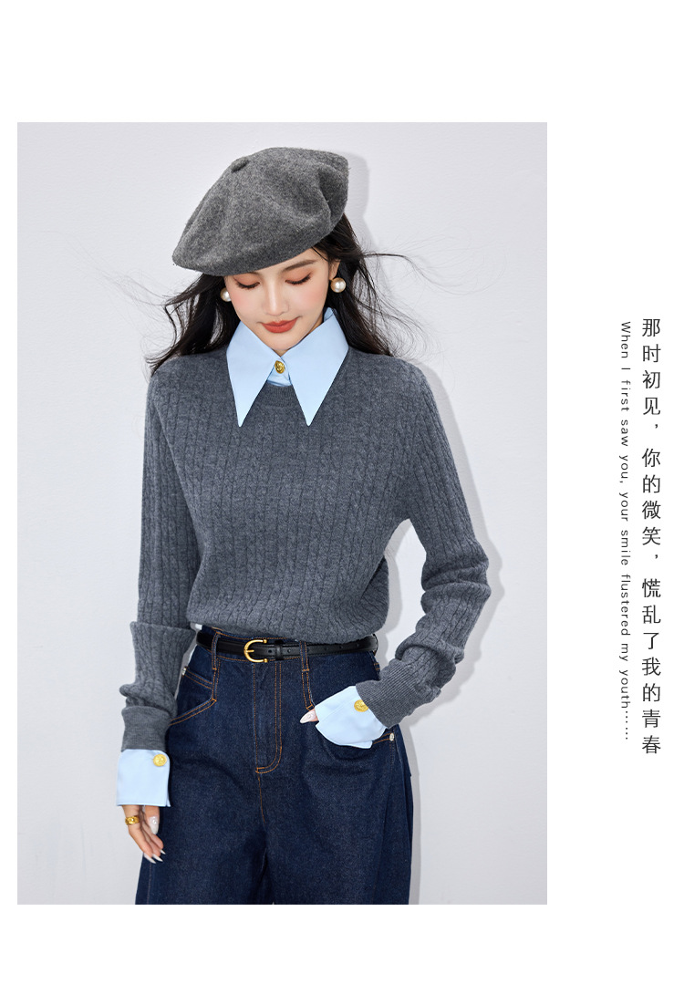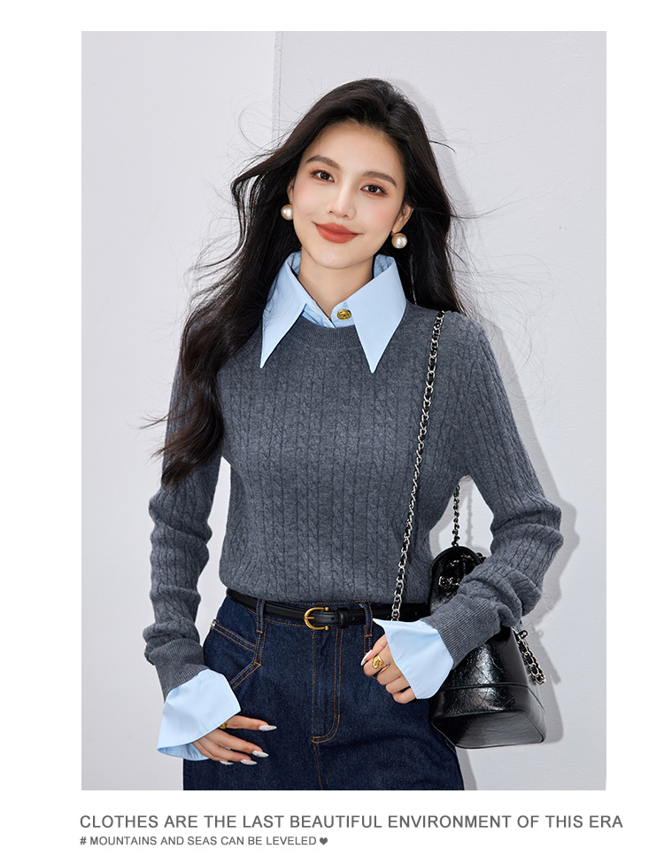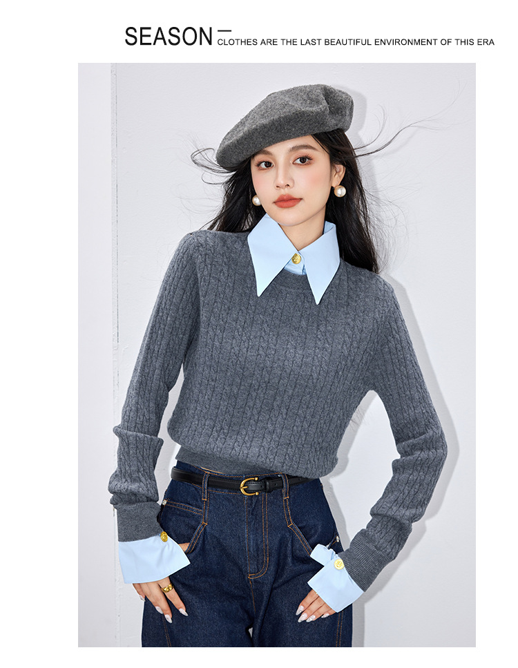 지식인 여성용 스웨터 2024 겨울 신상품 우아한 투피스 스타일 폴로 칼라 배색 풀오버 니트 상의