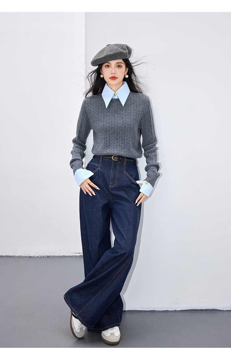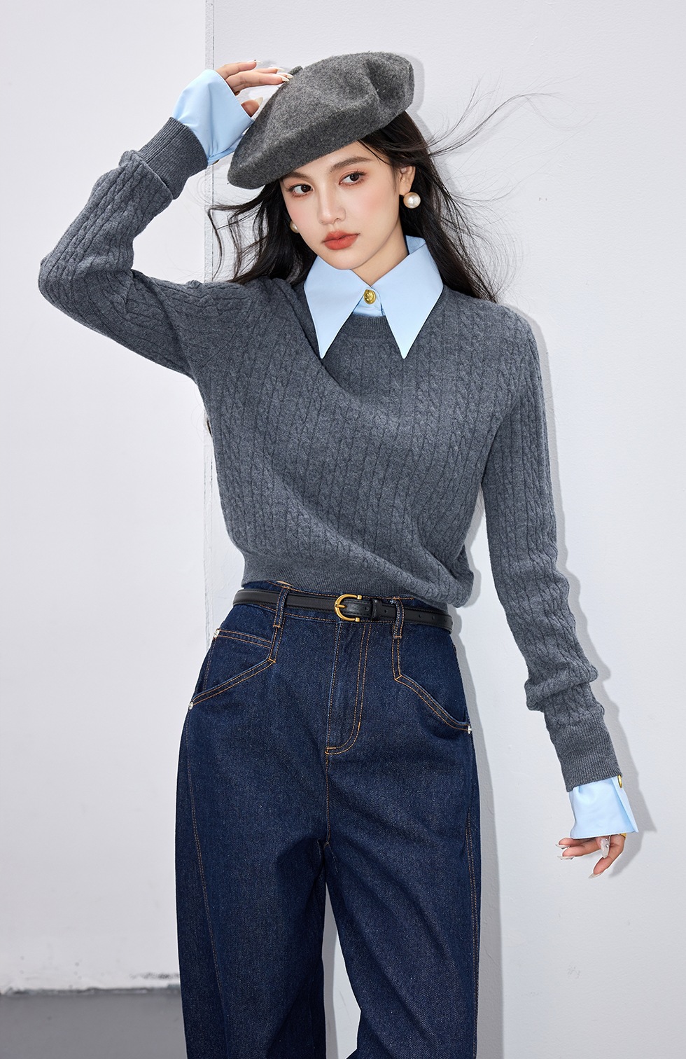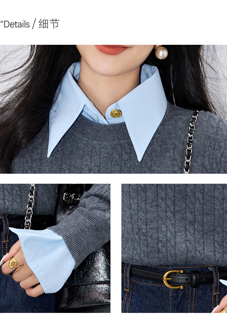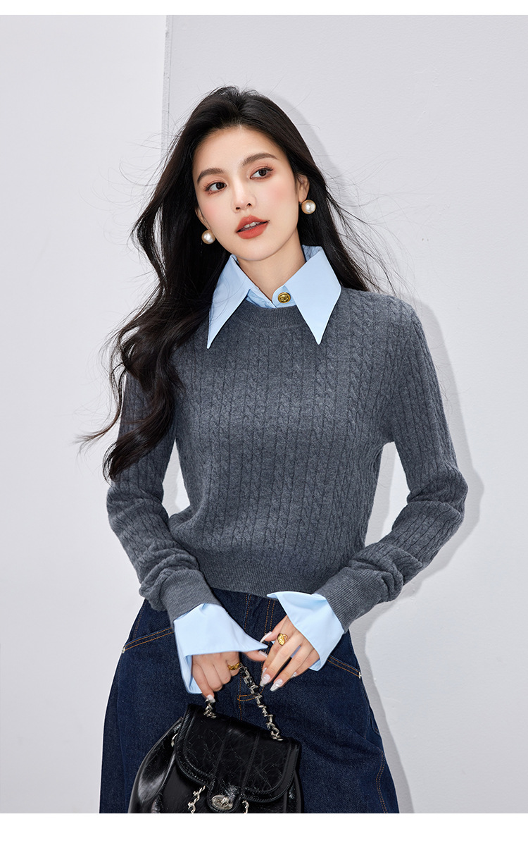 지식인 여성용 스웨터 2024 겨울 신상품 우아한 투피스 스타일 폴로 칼라 배색 풀오버 니트 상의