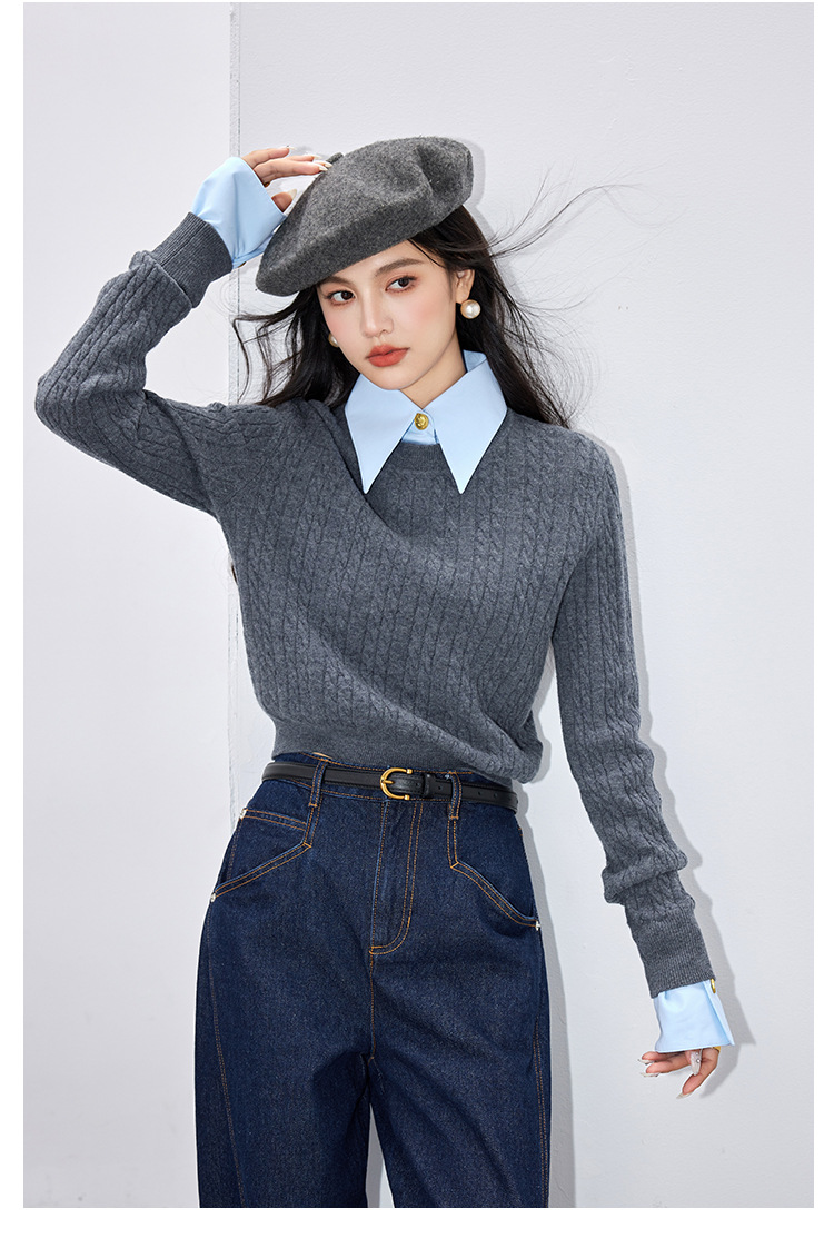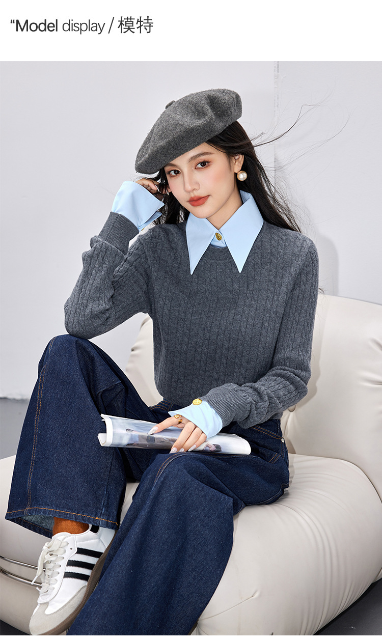 지식인 여성용 스웨터 2024 겨울 신상품 우아한 투피스 스타일 폴로 칼라 배색 풀오버 니트 상의스토어 가기