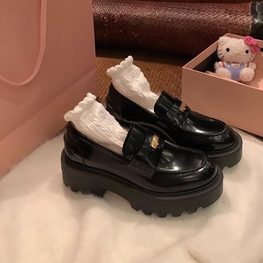 Miu Home ~ 비싼 금화 작은 가죽 신발 여성의 두꺼운 바닥 증가 블랙 조커 게으른 한 페달 라운드 헤드 Lefu 싱글 신발