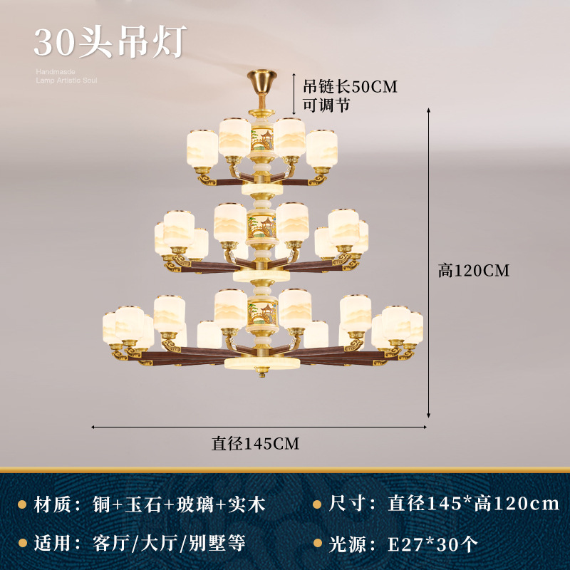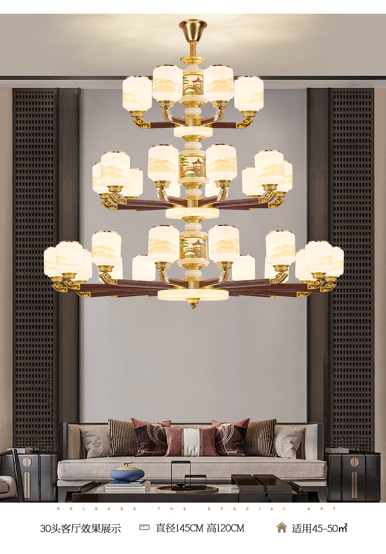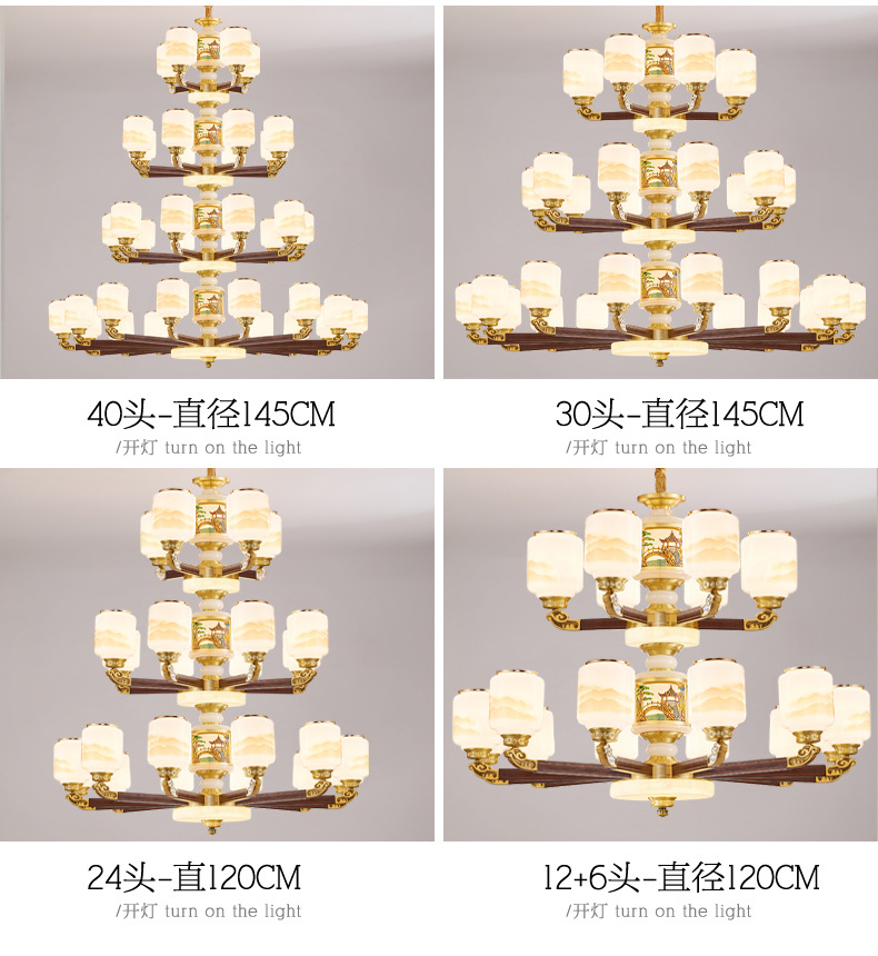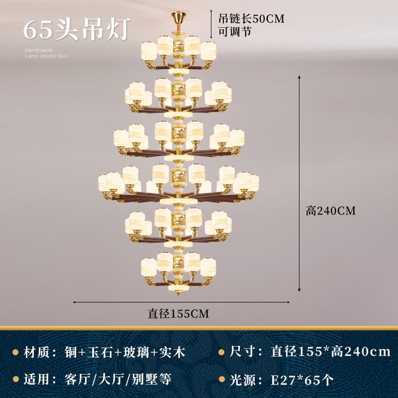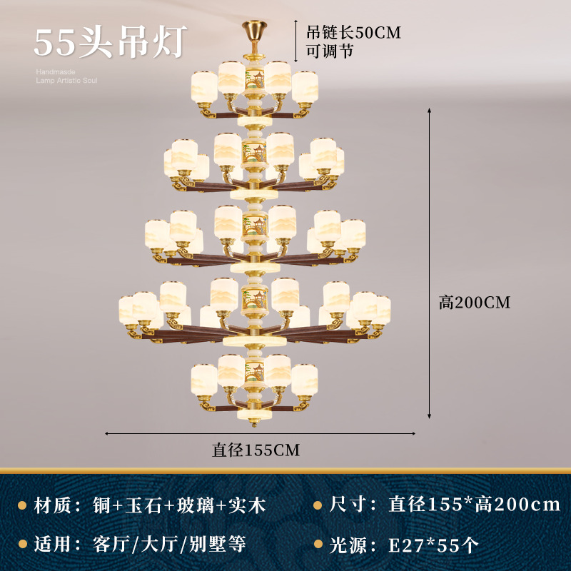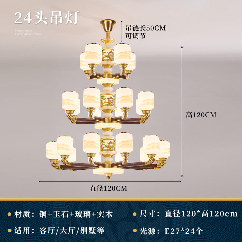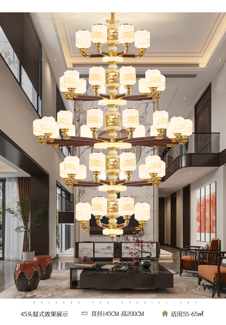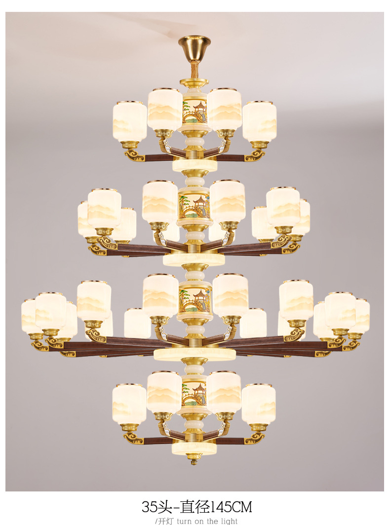 빌라 샹들리에 새로운 중국 스타일의 모든 구리 거실 중공 이중 건물 분위기 자체 제작 된 단단한 목재 옥 램프 도매