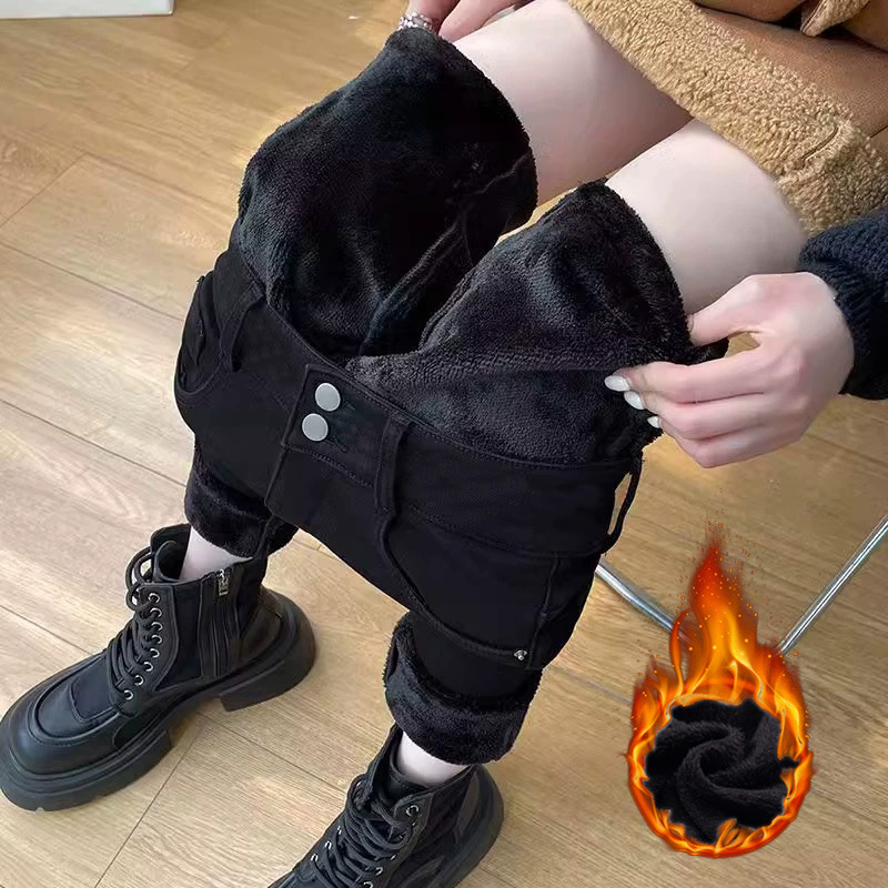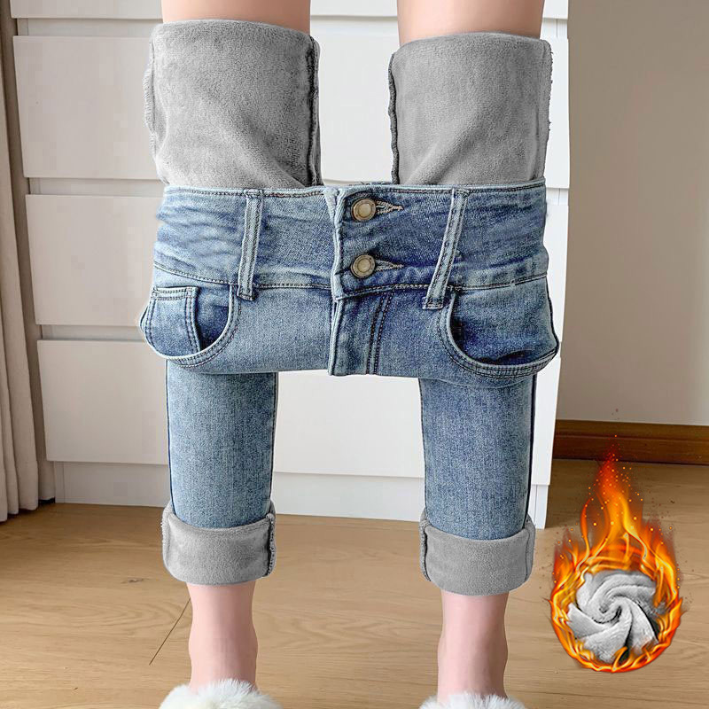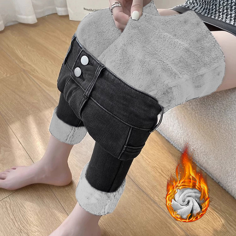 단단한 스트레치 연필 스키니 바지 따뜻한 두꺼운 높은 허리 더블 버클 엉덩이 리프팅 블랙 기모 청바지스토어 가기