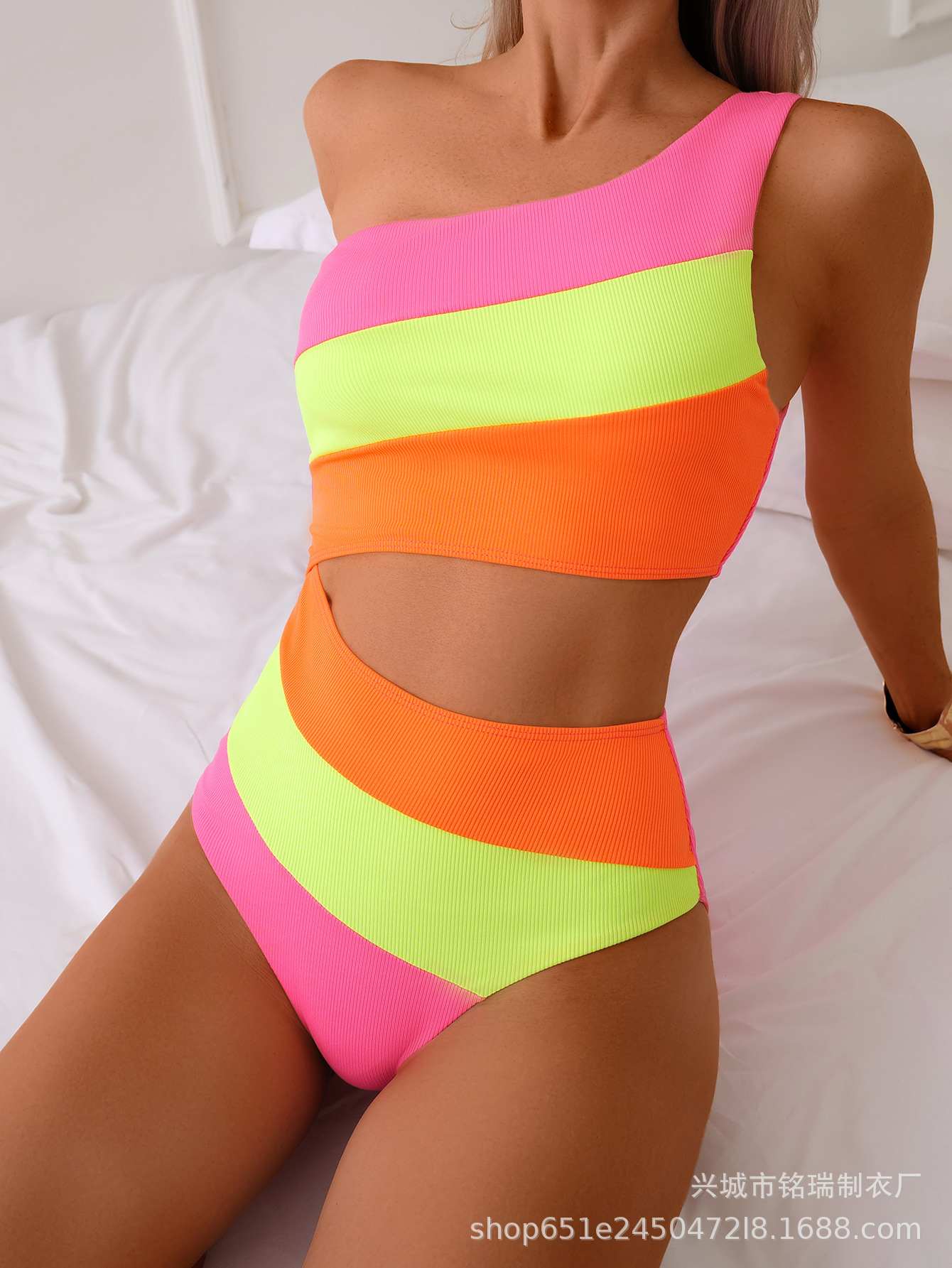 여성용 2025년 신상 대비색 비키니 수영복, 섹시한 허리가 드러나는 오프숄더 원피스 수영복, 공장 도매스토어 가기